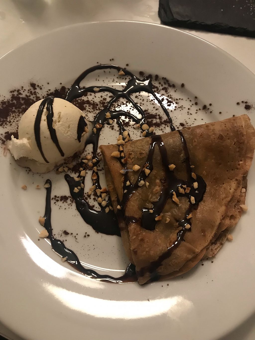 Crepe with vegan Nutella, hazelnuts and ice cream. (No hazelnuts on th…