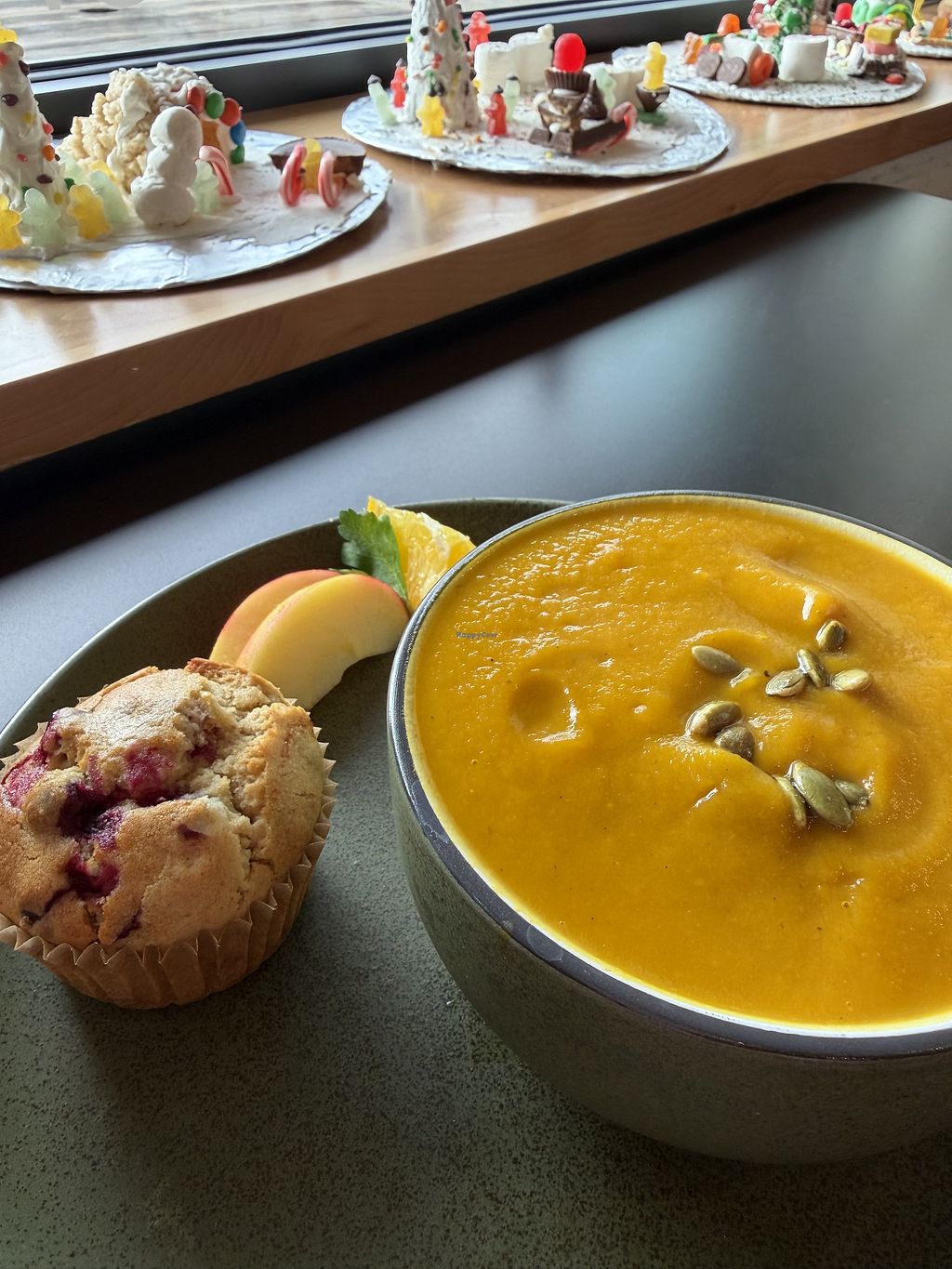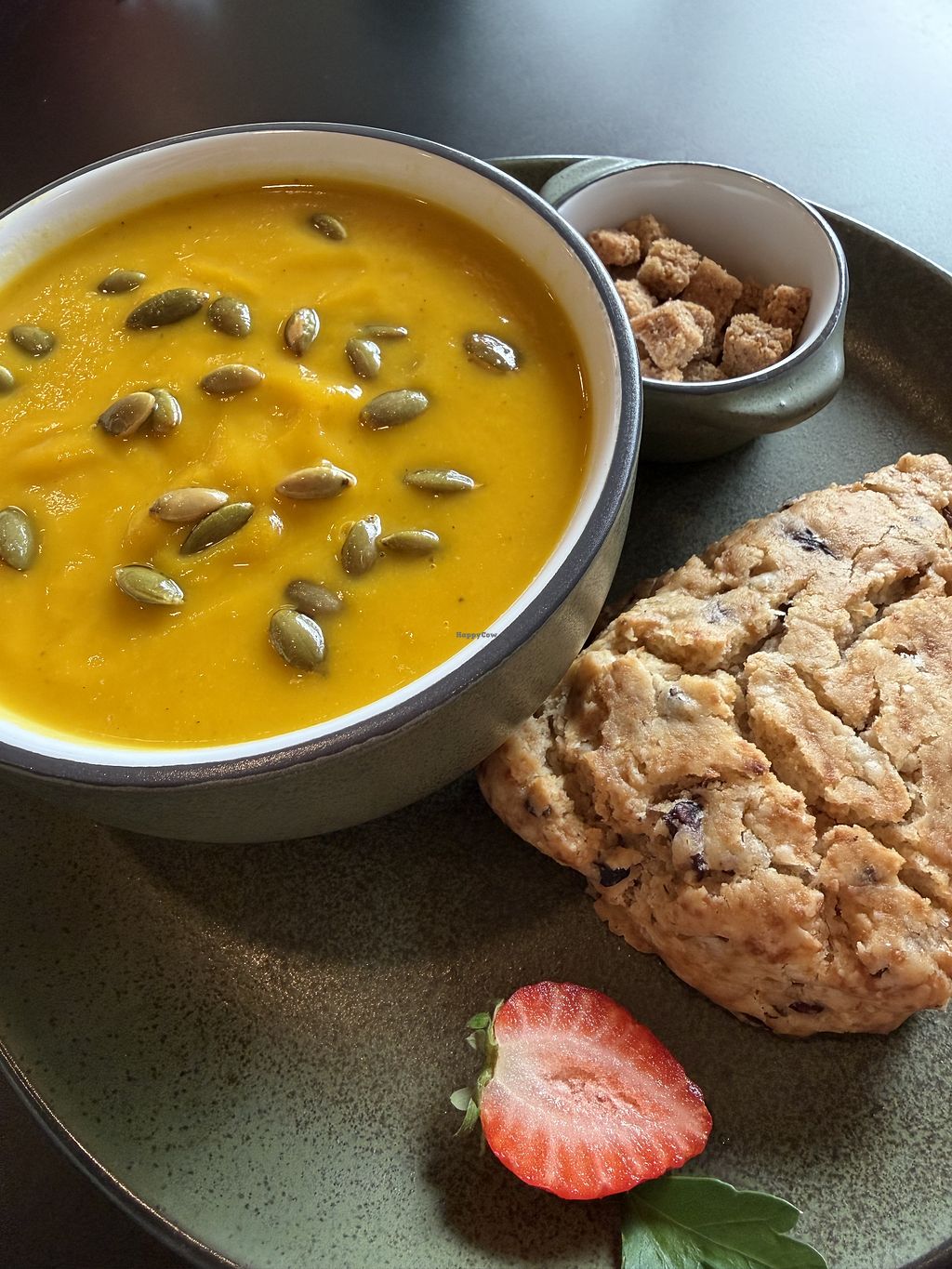 Seasonal Carrot-Ginger soup with Kalamata Scone. Soup is served niceβ¦