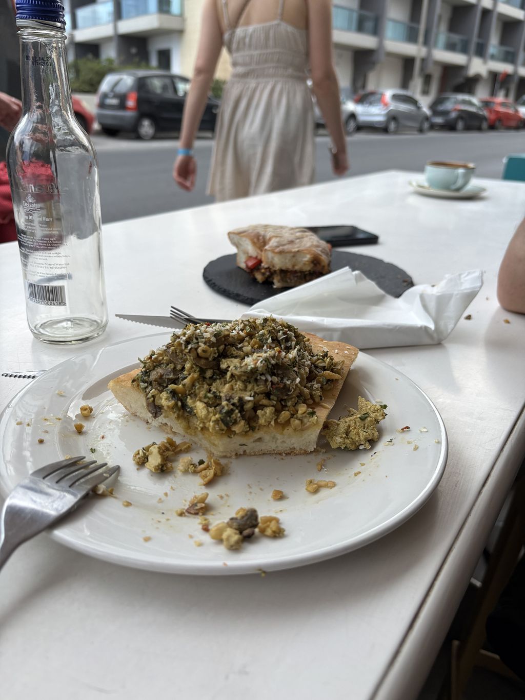 All vegan place with quite a lot on menu. Not just a bakery. We had the pizza slice and the focaccia with pesto and feta.