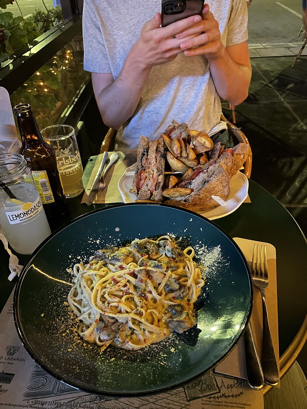 The staff is very nice, we had a salad, (which could be ordered vegan) vegan Club Sandwich and vegan Tagliatelle Carbonara. The Sandwich had a peanut sauce: delicious! (But that was too much for 2 people.. next time we would order only one main dish!!) 😅