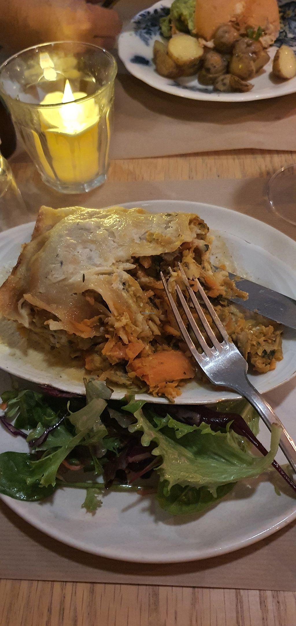I love to support a fully vegan place but I’m shocked by how highly rated this spot is considering the bad food we had. I’ve never been so misled by Happy Cow reviewers. We got the lasagna and the burger. The lasagna had a small piece of seran wrap sitting on top (!!!!) which we had no idea how the server did not notice that when picking it up. The vegetables in the lasagna were so unevenly cut that many were extremely undercooked. There was almost no vegan ricotta and no tomato sauce in sight so I’m not sure how that dish would be described as lasagna either. The flavors of the burger weren’t bad but the patty was extremely mushy. I definitely would not recommend even if you’re starving. The side salad was literally lettuce and dressing, and the potatoes on the side of the burger had no seasoning 😬 Each of those dishes was around 20 euros, yikes.