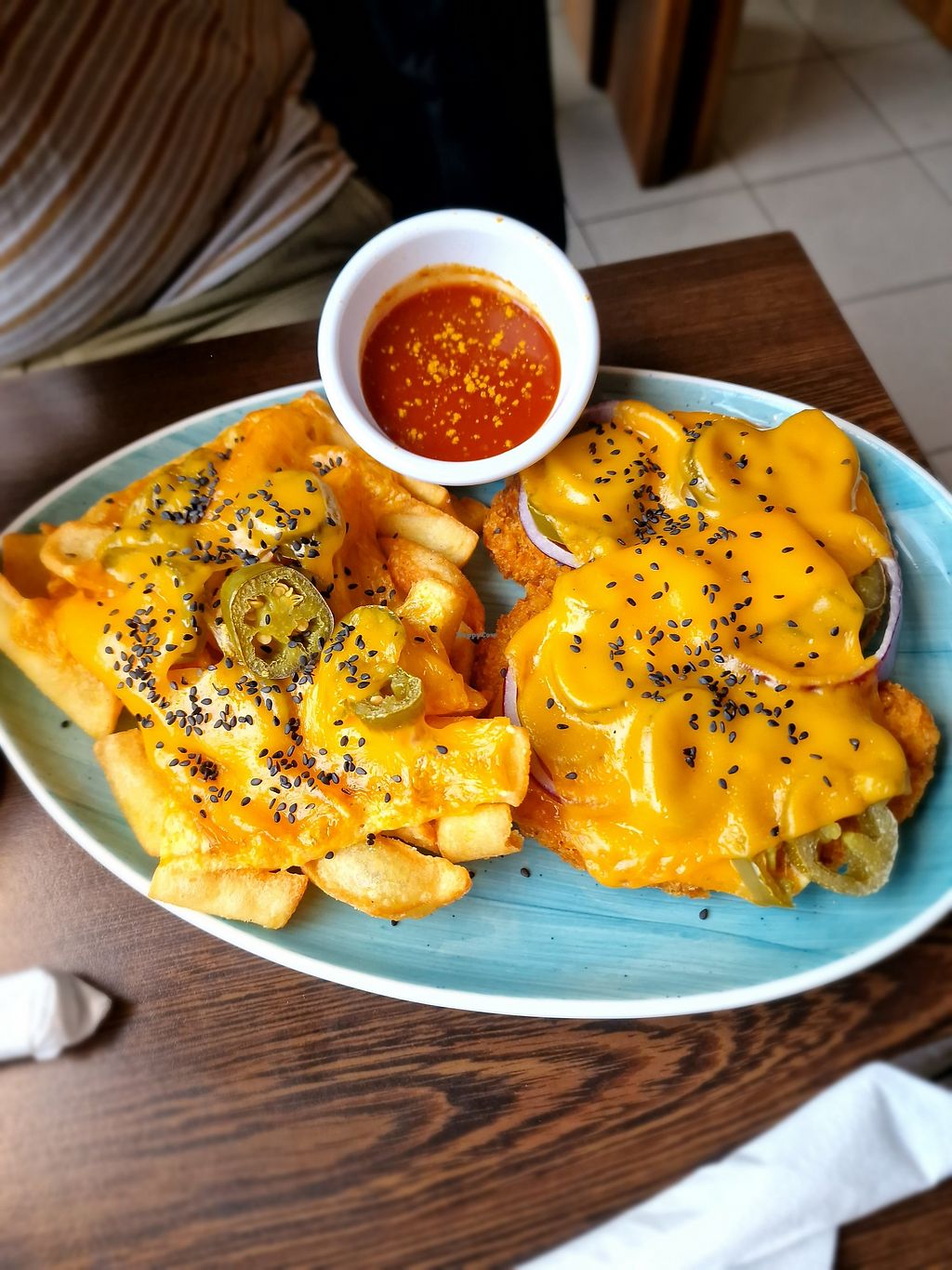 Falafel Cheeseburger, mit Süßkartoffelpommes und Guacamole