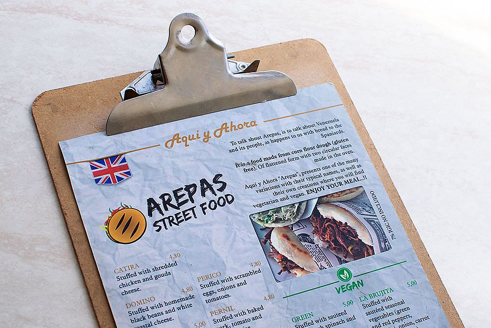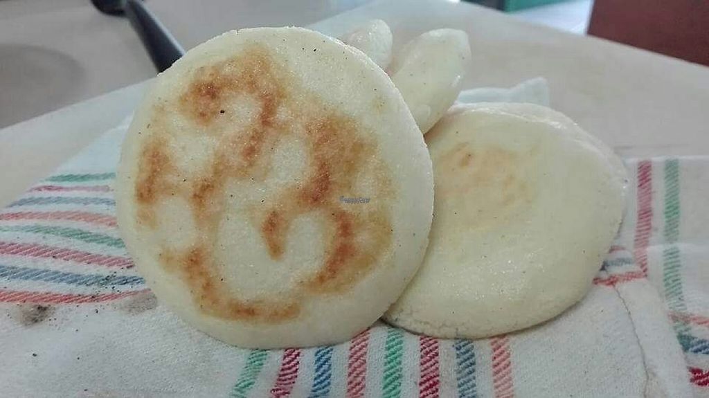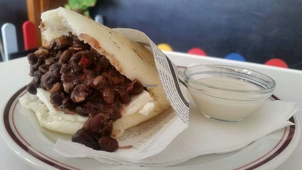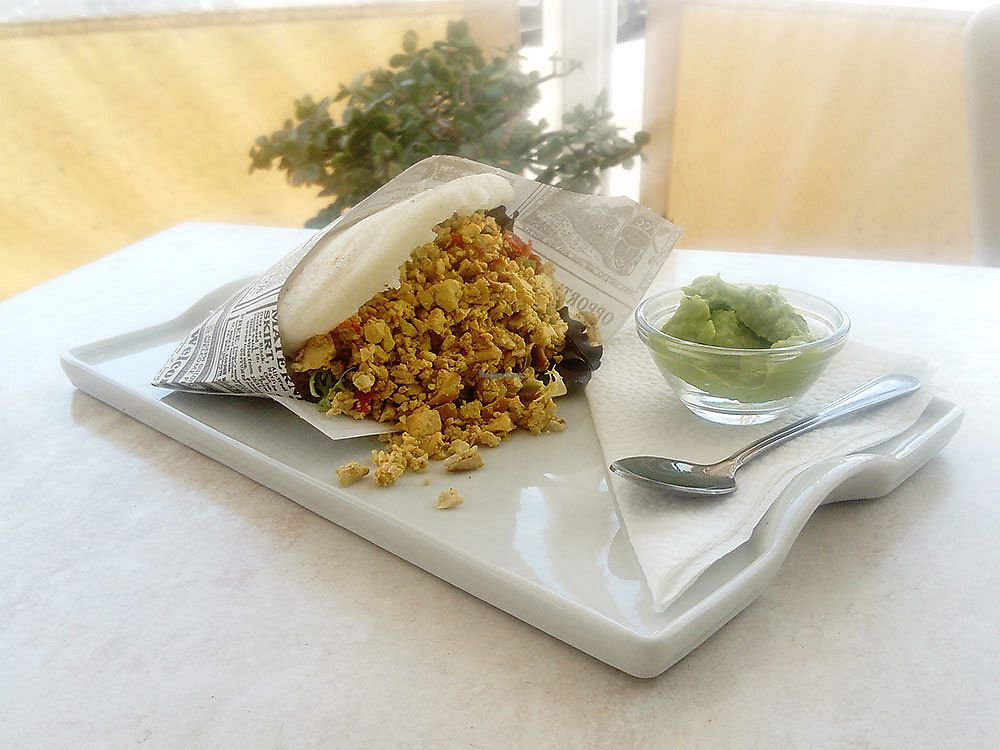 Venezuelan corn arepa with hummus, avocado, and vegan sausage