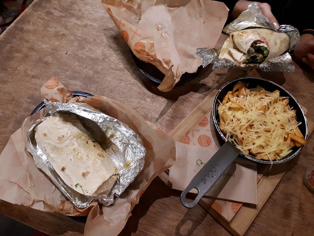 Fried risotto balls, mushrooms and veg in wraps and a side of cheesy c…