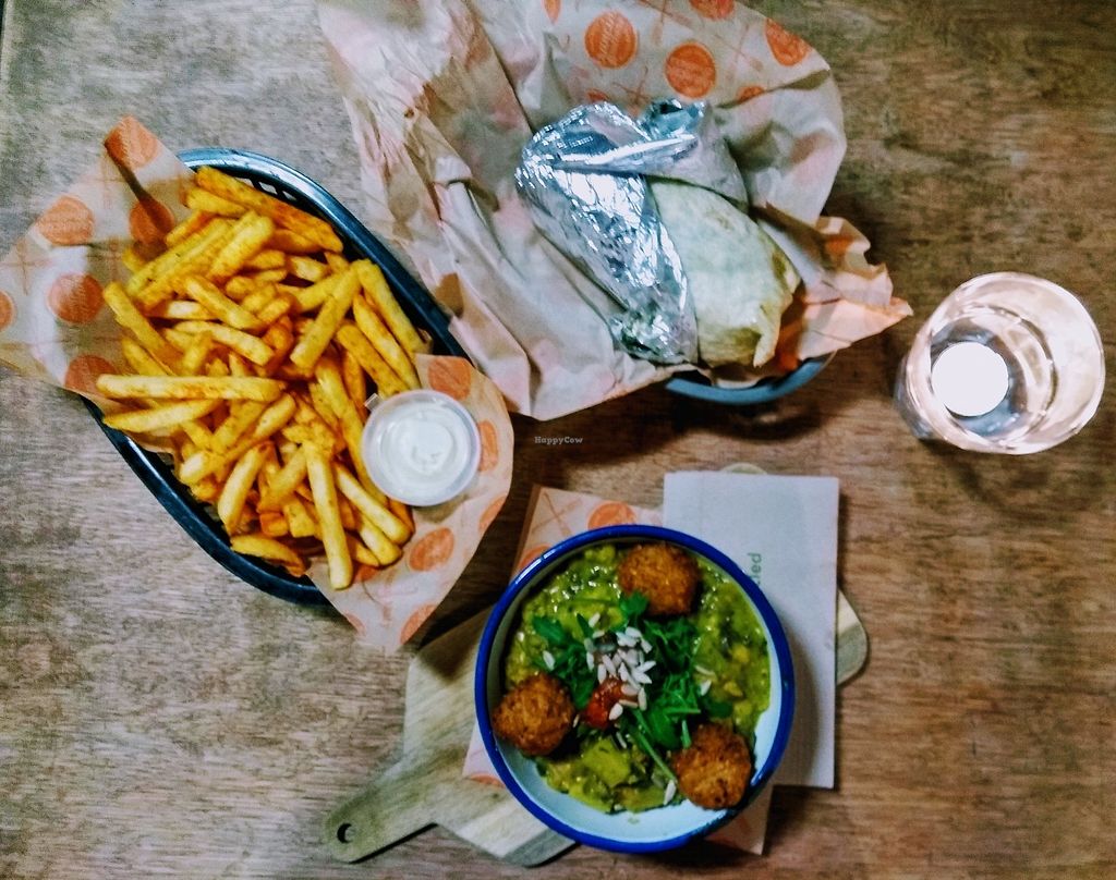 Fries with garlic mayo, chimichurri mushroom wrap, chick'n spinach and…