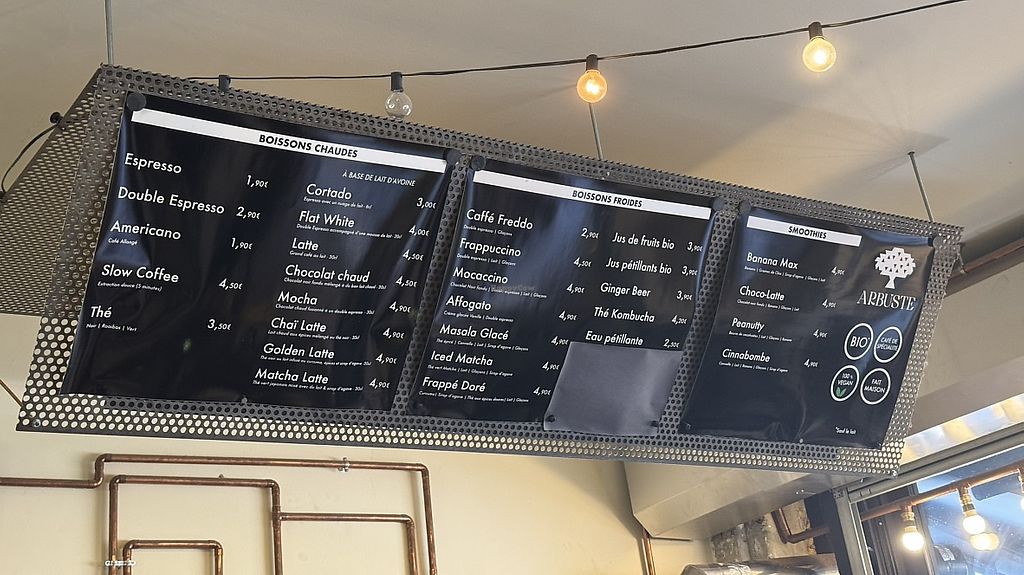 A vegan cafe serves a large variety of hot drinks, smoothies, and pâtisseries. Also sells organic and artisanal roasting coffee beans. Instagram: @arbuste.cafe. Open Tue-Sat 10:00-18:00. Closed Sun-Mon.