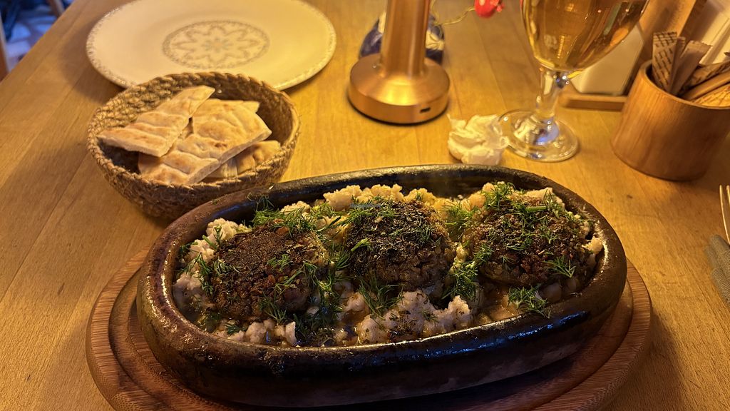 Great place to eat vegan. A lot of options. And the scenery within the stone cellar filled wine bottles and pottery is very welcoming. Had the green lentil patties casserole bedded in Kash-kek. Highly recommend.