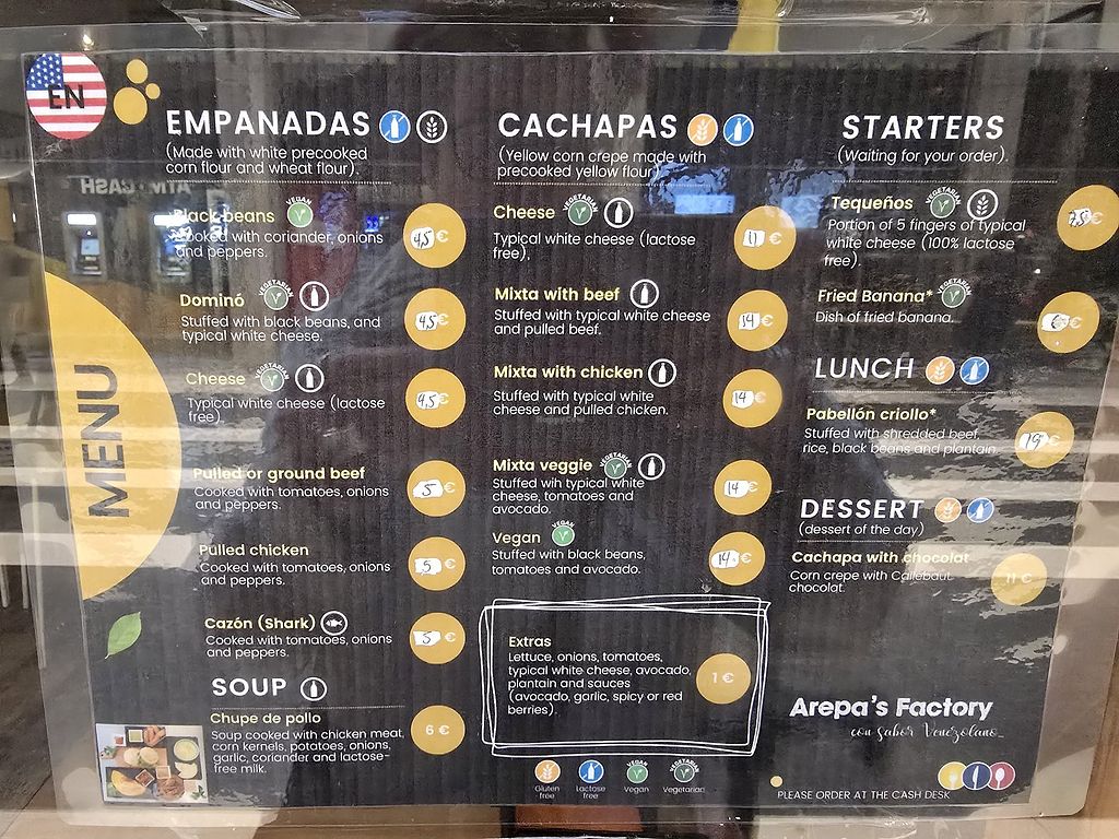 Serves meat, vegan options available. Small Venezuelan snack bar with clearly labeled menu. Example vegan dishes include arepas with filling combinations including black bean, avocado and plantain, chickpea lentil meat and black bean with onion. Also offers vegan empanadas and cachapas. Open Mon 10:00-15:30, Tue 10:00-16:00, Wed 10:00-16:30, Thu 10:00-16:00, Fri 10:00-15:30. Closed Sun & Sat.