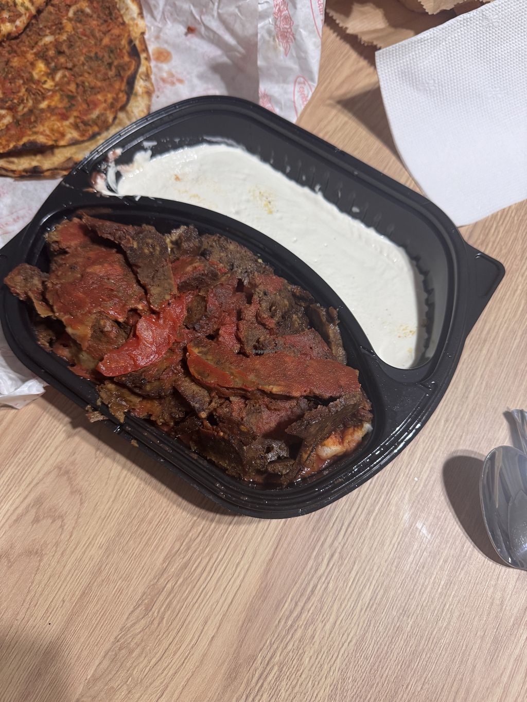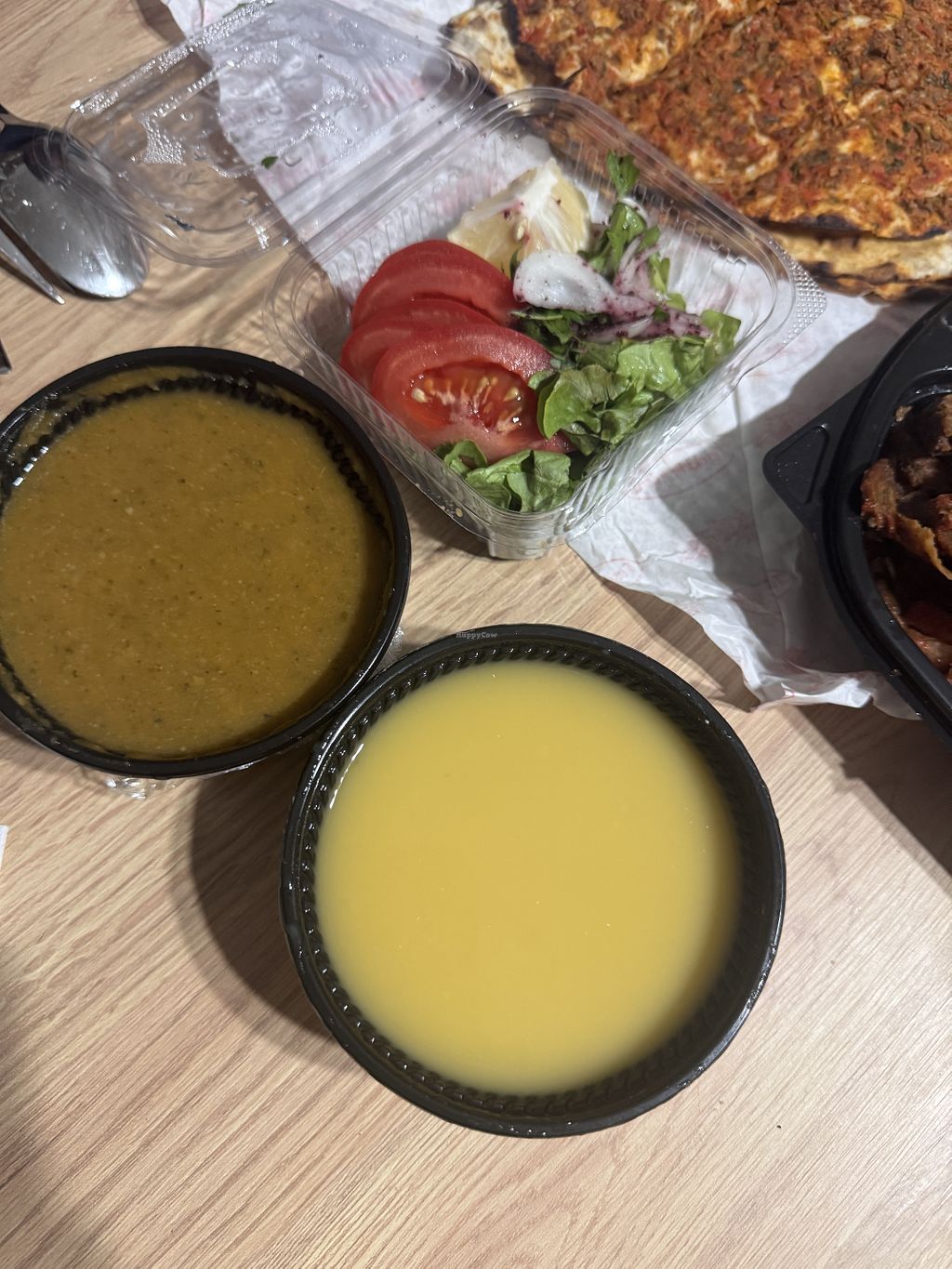 We ordered from Arka Bahçe Café Veganarya online. Unfortunately, the lentil and vegetable soups were not very flavorful, but the vegan lahmacun and vegan Iskender kebab were excellent. Even the non-vegans at home loved them.