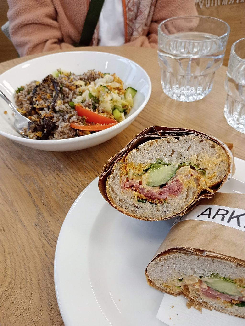 Cinnamon buns & other sweets, diff. hot drinks like matcha latte;golden chai latte;coffee with plant-based milk, 2 wraps (pulled roots;sweet patato & hummus), salad (beetroot & kale;sweet patato & hummus), ciabatta bread with hummus & tomato #Veganuary