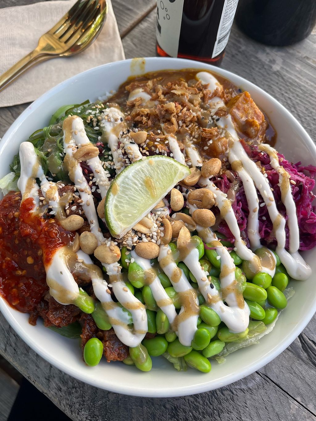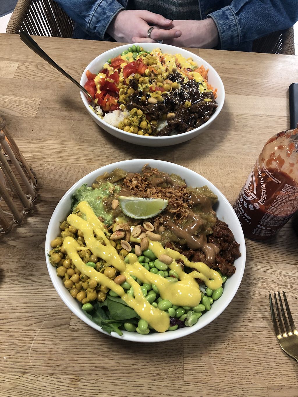 You can create your own bowl with several toppings and sauces. Also a source of protein (tofu, vegan chicken, etc.). Good and filling!