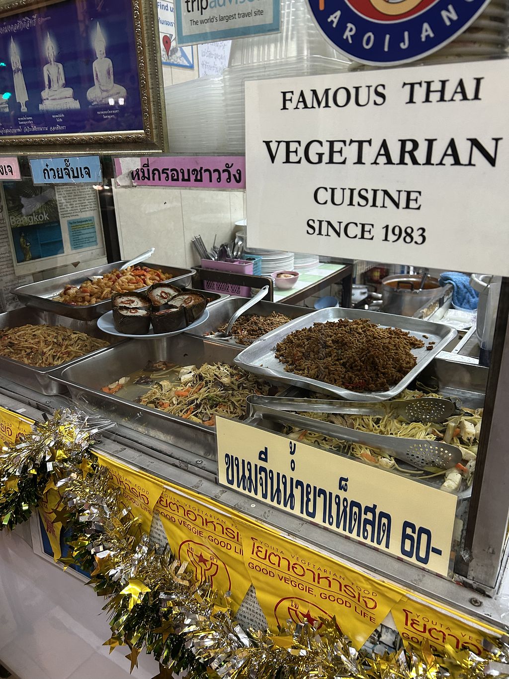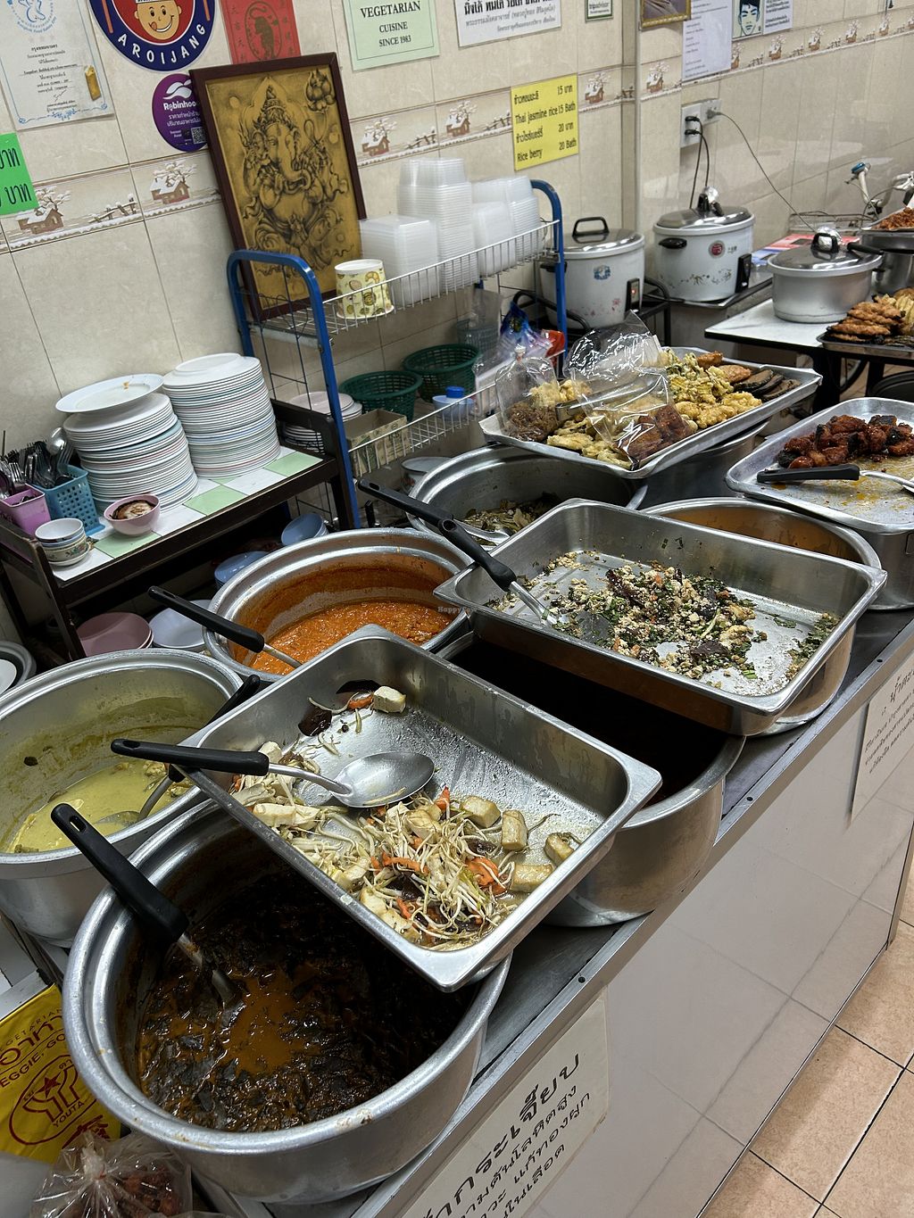 Buffet style so earlier the better for freshness and options. This restaurant was one of the first veggie places in Bangkok and the walls are covered in awards and lonely planet articles where they have been recognised. We asked the owner for her recommendation (rice with three toppings) and all of it was delicious. You must also try the crispy fried mushroom in the little bags- she said they are a local famous dish. Seriously yummy, really cheap. Staff are lovely 😊