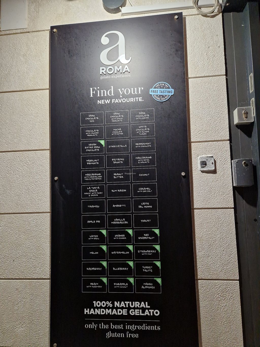 Ice cream shop offering vegan options including dark chocolate, lemon with basil, strawberry with mint, raspberry, and mango. Open Mon-Sun 10:00-00:00.
