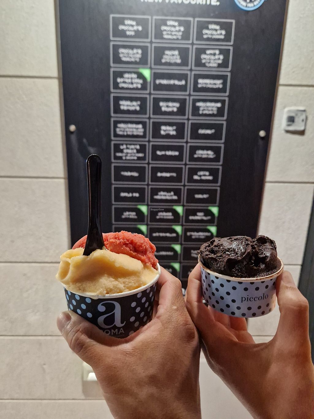 Read moreVegan options are clearly labelled which is a plus. However vegan cones cost extra! Cones are not vegan per default. Resulting in a whopping 10€ for 2 rather regular sized cones of icecream. 🥴