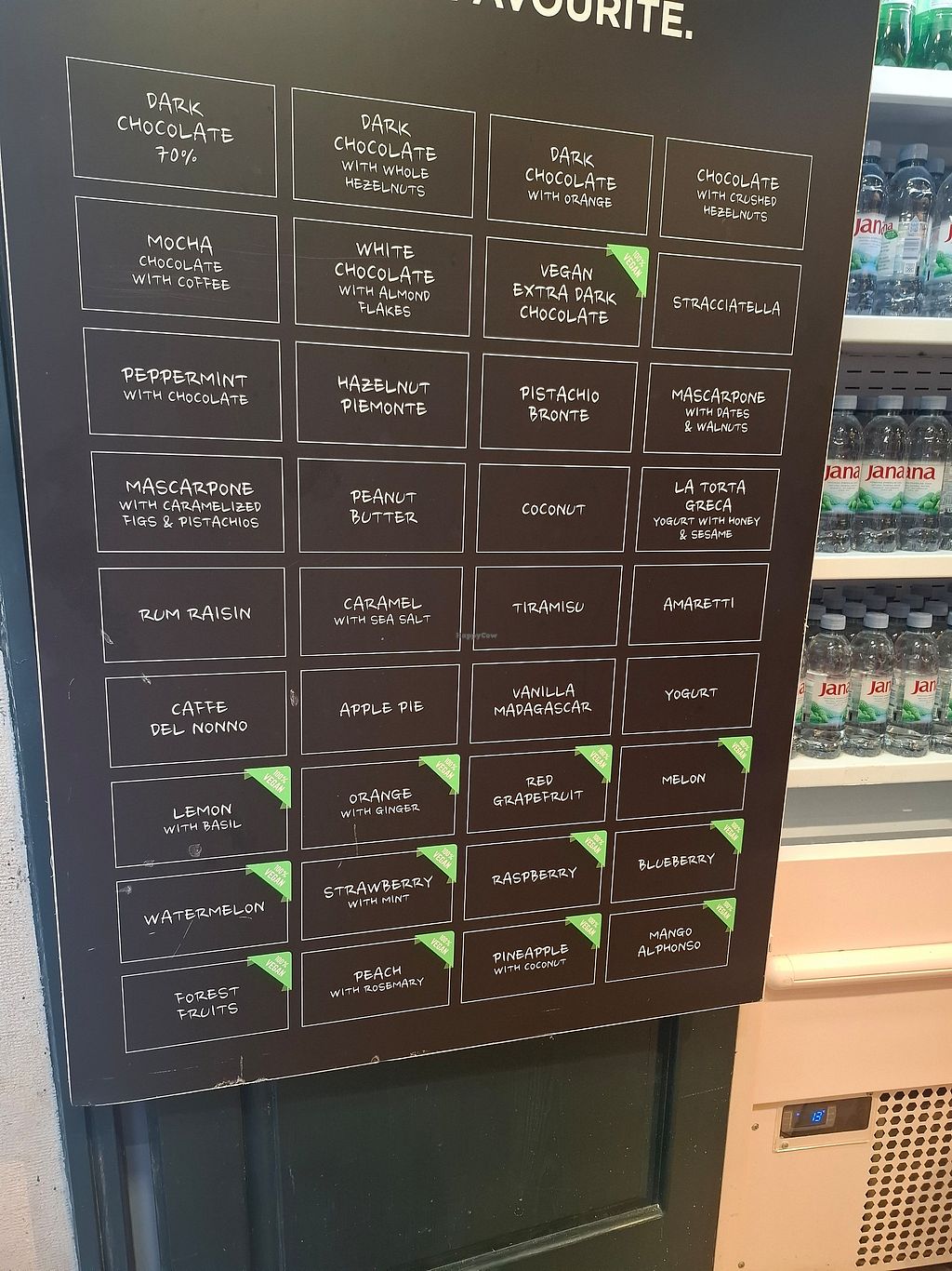 Really impressed with the selection on offer, around 6-8 varieties of sorbet available and cleared marked as 100% vegan. Highly recommend the forest fruits and mango, great combo!