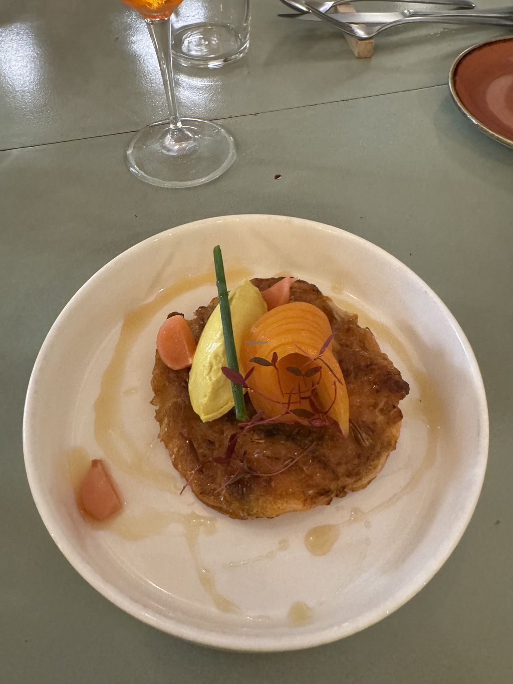 Nice ambience in a lovely area. Friendly staff. Food was a bit experimental, and thus hit and miss. The Charred Cardoncelli mushrooms "alla Luciana" potato salad, pickled onion was declared ‘interesting’. The mushrooms were chunky and very meaty, served on a bed of lukewarm mashed veg. And the tofish sandwich was literally served with crisps, which was unexpected in so fine dining a spot. Desserts were good.