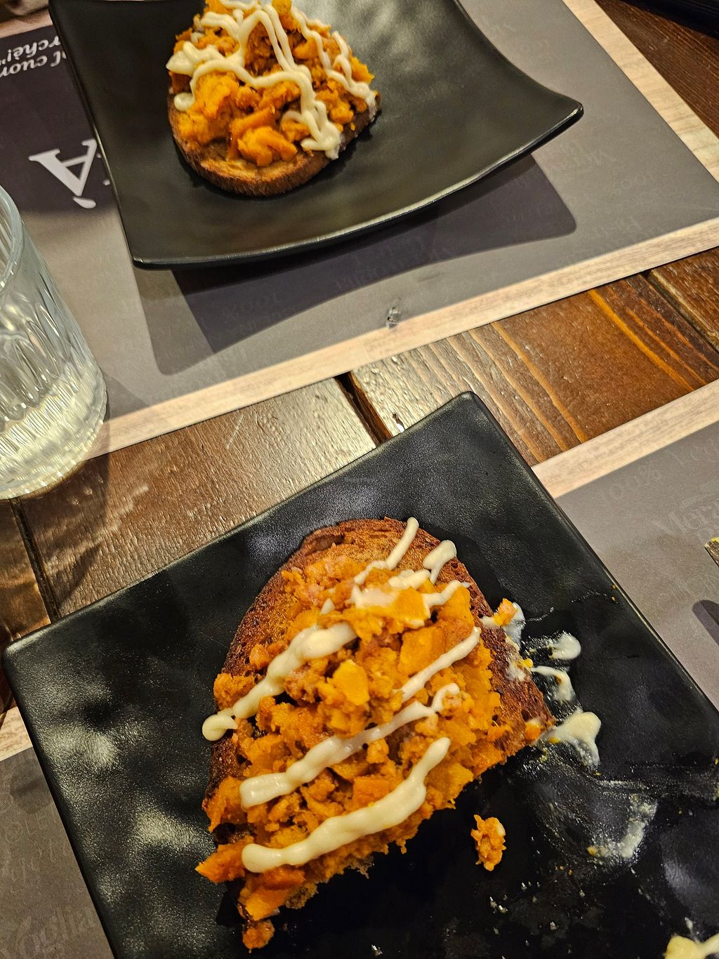 We started with two appetizers: the pumpkin bruschetta and the double-fried ravioli with vegan salami. Both were flavorful and well-prepared. For mains, we had the genovese penne and the potato pasta oven casserole. Both dishes were delicious and creatively used plant-based meats and cheeses without losing the classic Neapolitan soul.