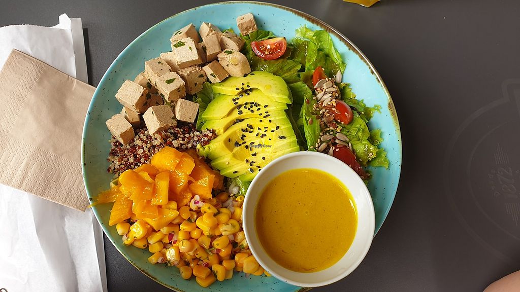 Vegan options include a wrap and a bowl, and there were three vegan treats (chocolate ball, cookie, carrot-cake muffin). Coffees and teas. I enjoyed the vegan bowl, which had avocado, quinoa, green salad, tofu and a good corn-mango mix. Nicely priced at EUR 9,50. Good chocolate-orange cookie and muffin.