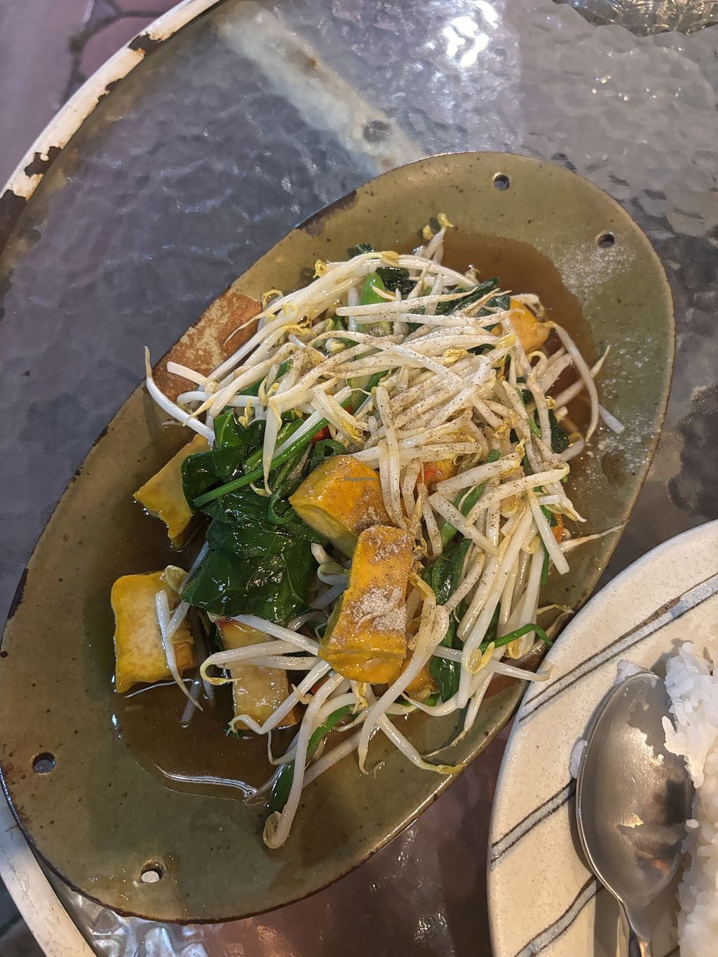 I had the stir fry tofu with plain rice and it was good. Owner was so lovely and introduced himself upon me entering the restaurant, made conversation and was generally very polite. There is a page in the menu of vegan, and a page of vegetarian. There are next to no vegan food places around, so this was a nice find. For stir fried tofu, a plate of rice, and a Fanta, it was 260 THB which is reasonable for this area.