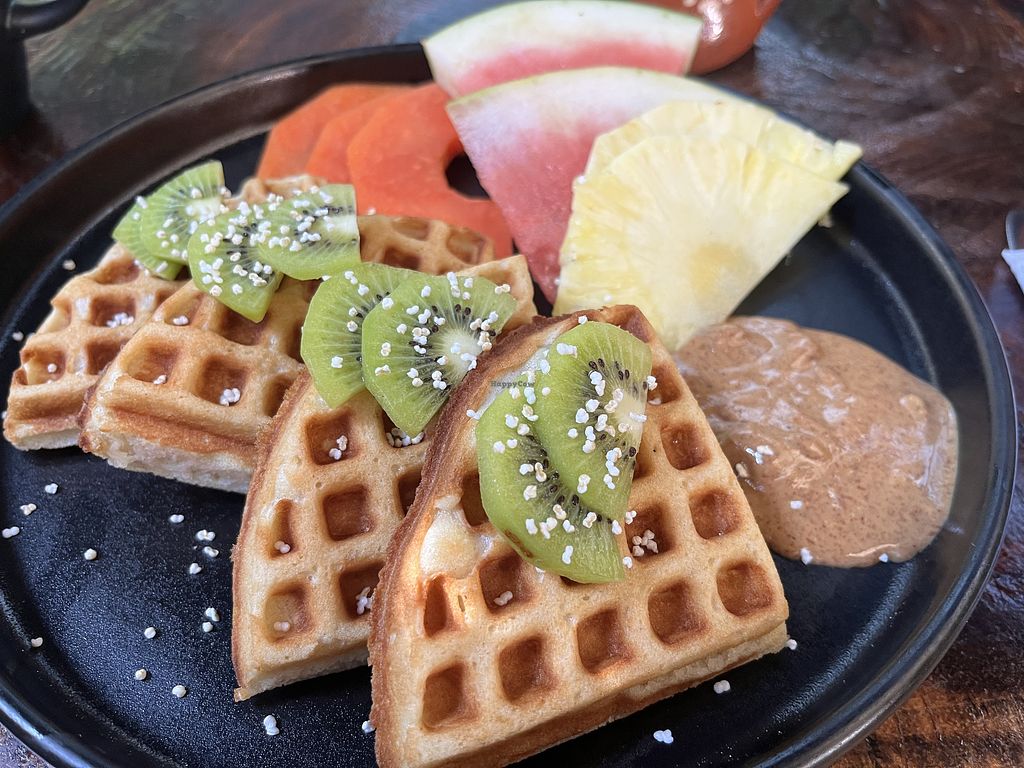 Waffle o Hot Cakes served with fruit, choice of almond or peanut butte…