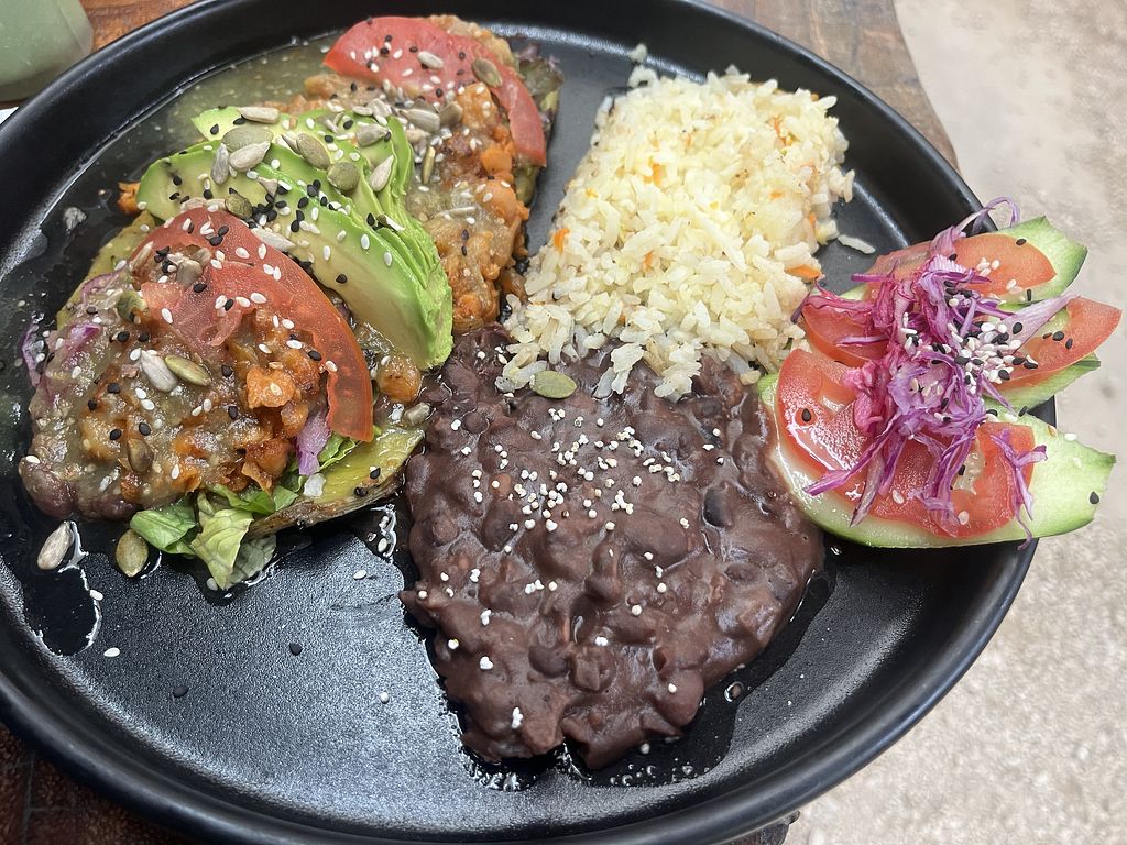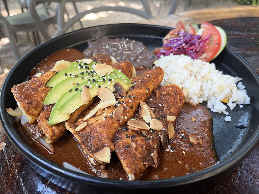 Enmoladas in almond mole topped with avocado and seeds. I chose mushro…