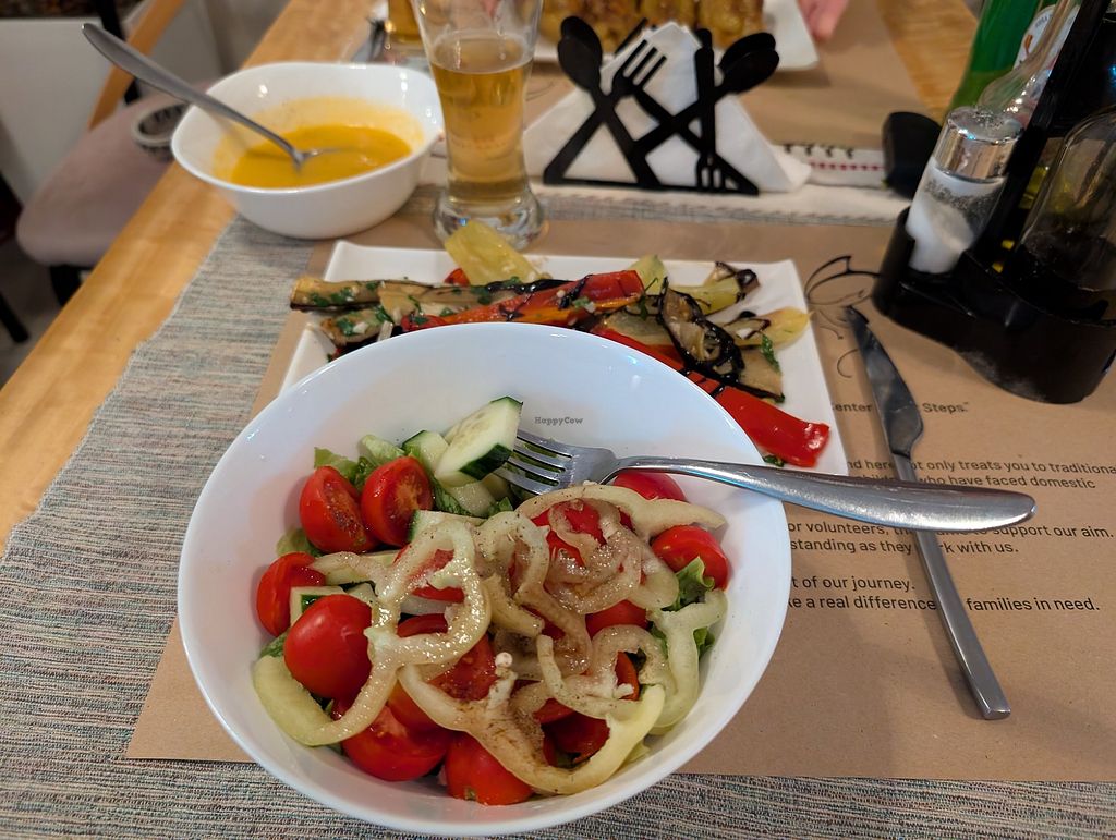 Lovely lady running the place showed us the menu with 90% vegetarian options, few of them were vegan. We took stuffed eggplants and peppers (delicious!), portions were quite small but you get basket of bread and it’s quite cheap. Generally place worth visiting.