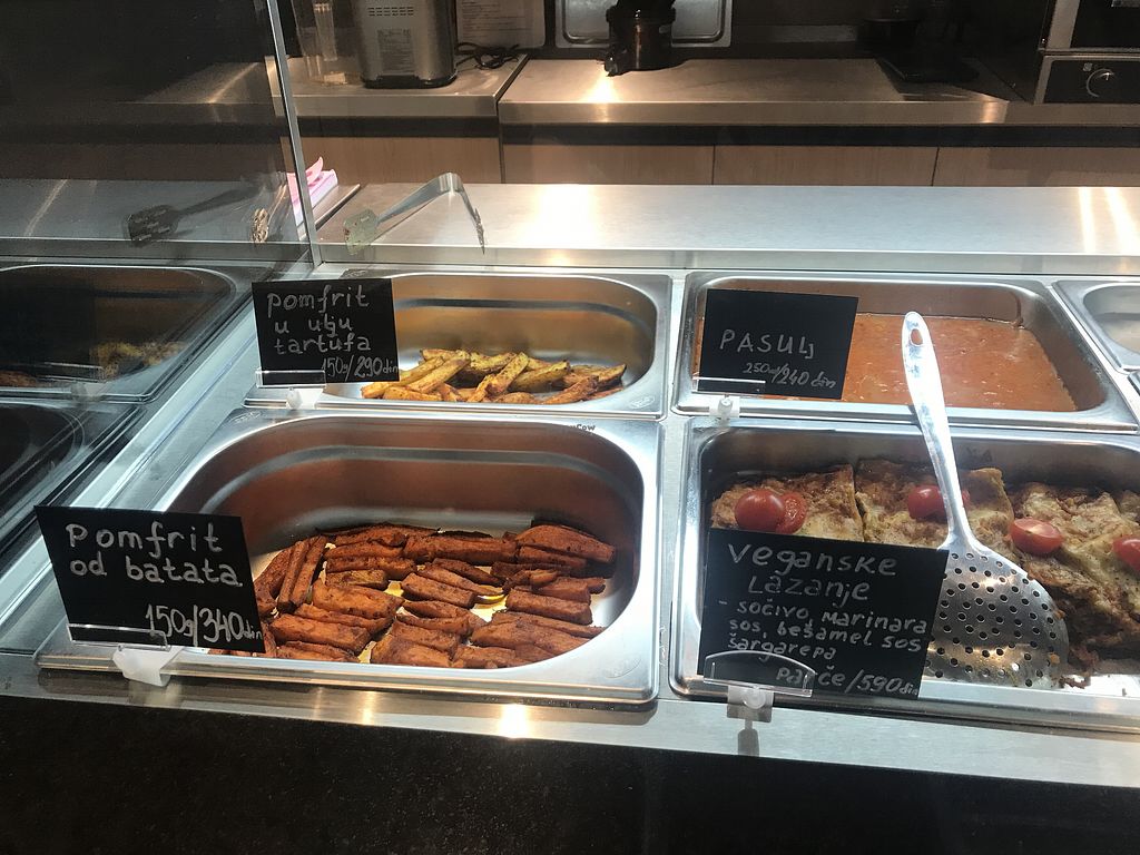 Fries, kumara fries, beans, vegan lasagne