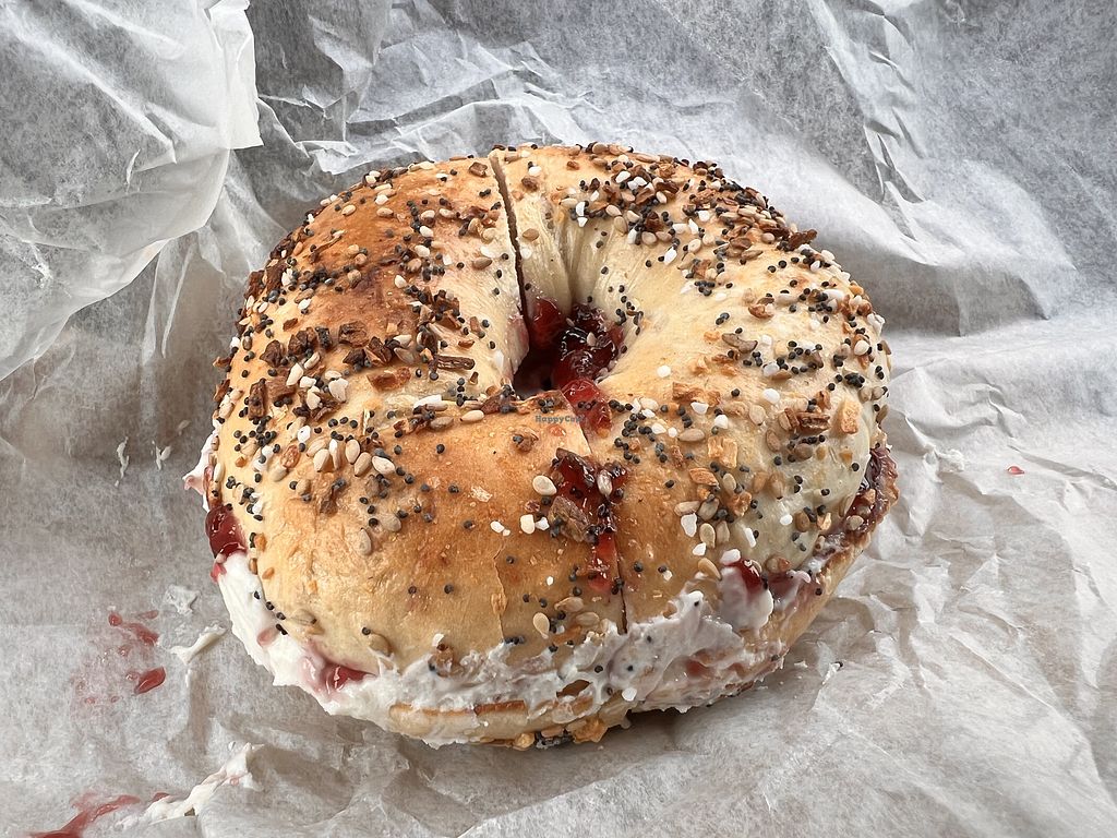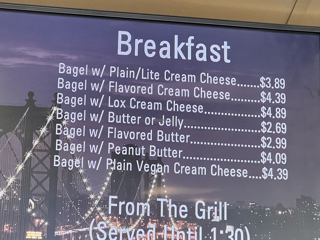 I was going to grab a bagel with grape jelly not knowing that they had vegan cream cheese on the menu which made it even more sweet! Also, they had non dairy creamer for coffee.