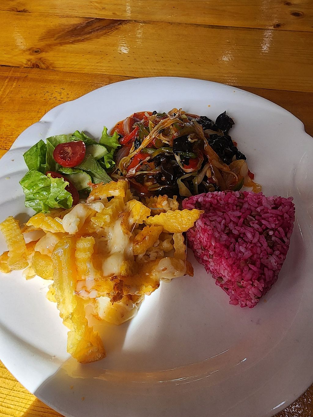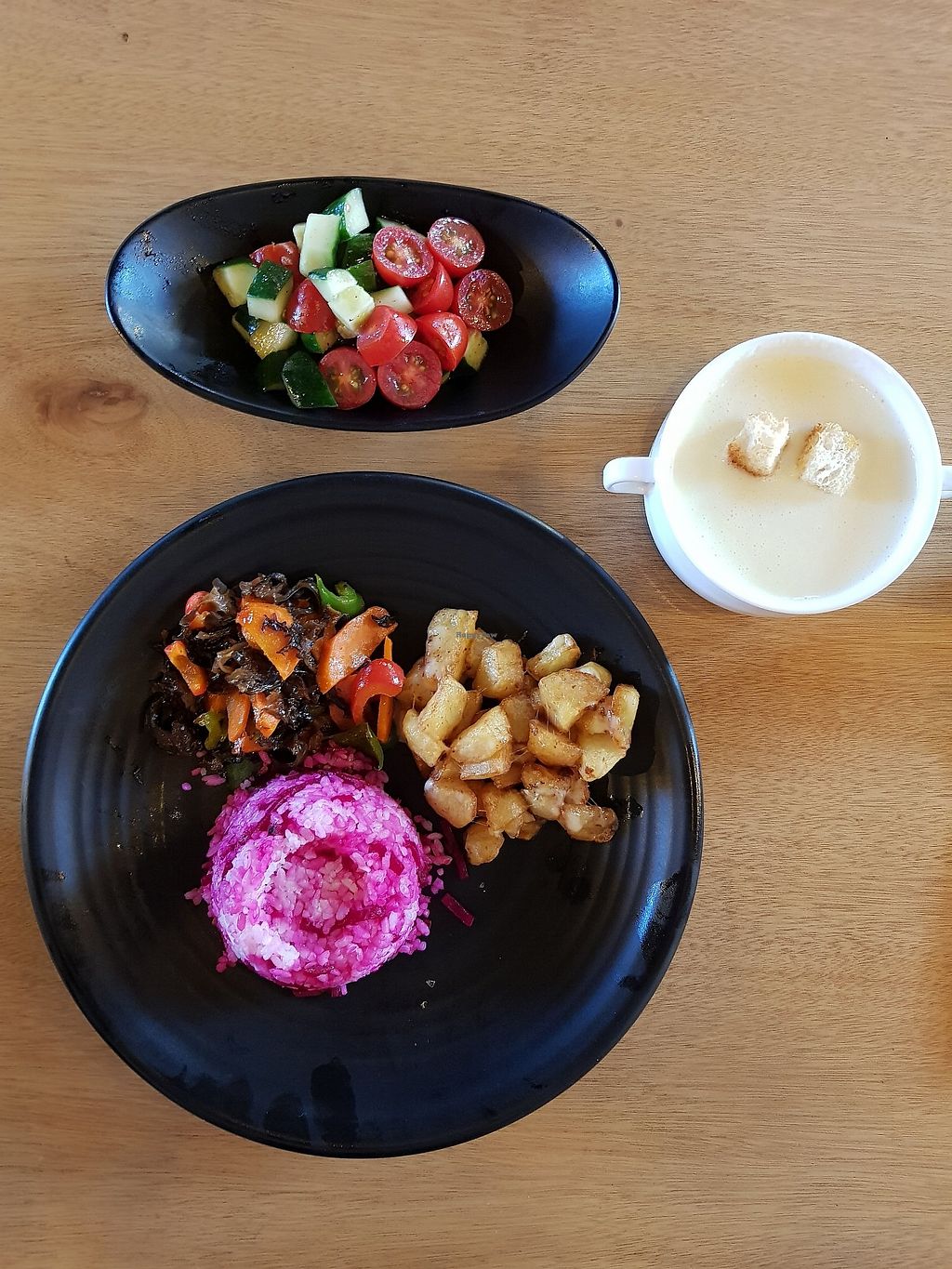 In a country where it's hard to escape meat in every restaurant dish, this place has some great vegetarian and vegan options including vegetarian pasta (can be done without cheese), various salads, vegetarian pizza (the pizzas seem to come with lots of cheese so you could try asking for without), and even a vegetarian set menu which included a potato soup, garden salad and a main of rice with beetroot, some stir fried vegetables and potato with cheese.