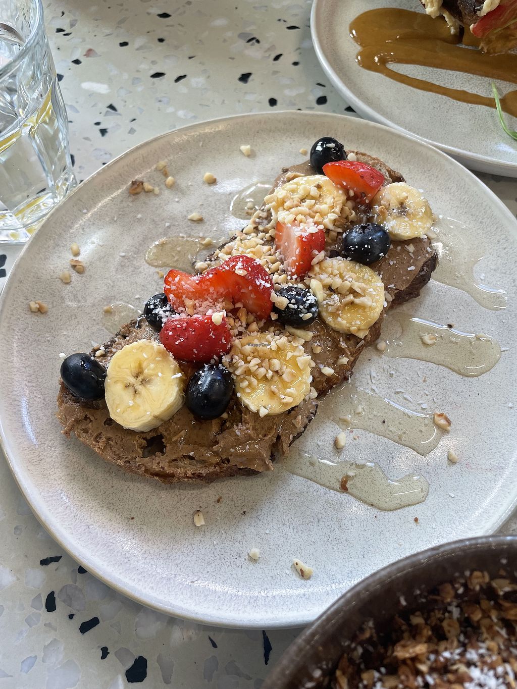 Colazione con Bowl vegana di gelato, frutta fresca e muesli, e per il mio compagno avocado toast.