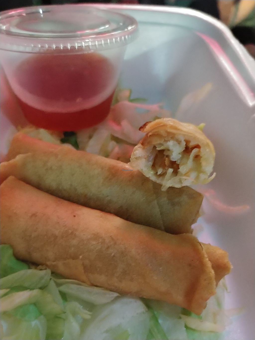 Vegan spring rolls with Thai sauce. Really good, they were fresh and f…