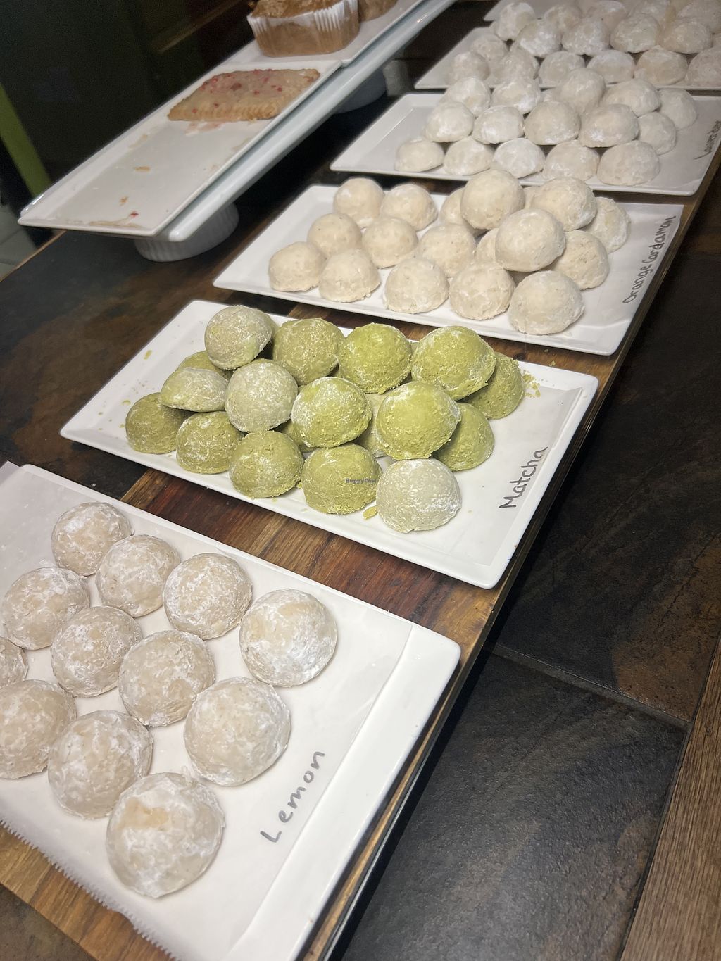 I was told explicitly that all the baked goods are vegan by default. Awesome! They have brownies, cookies, and several flavors of tea cookies. The brownie I got was perfectly moist and the tea cookies were lovely too.