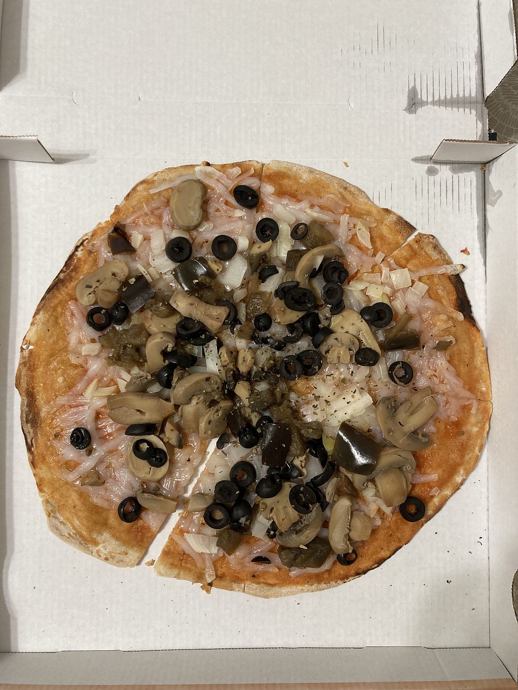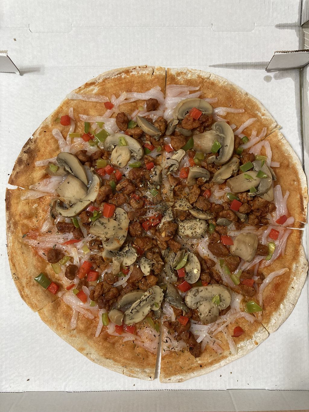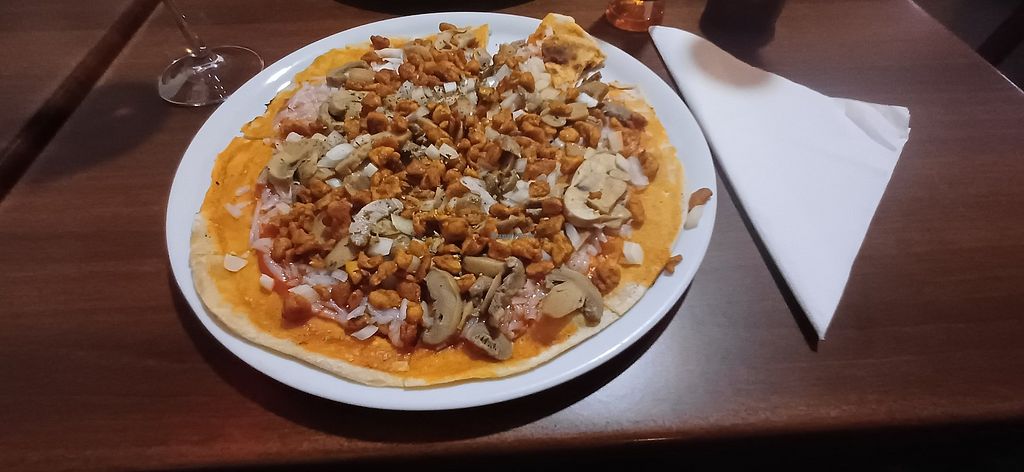 Pizza vegana con pimientos de piquillo, champis y cebolla