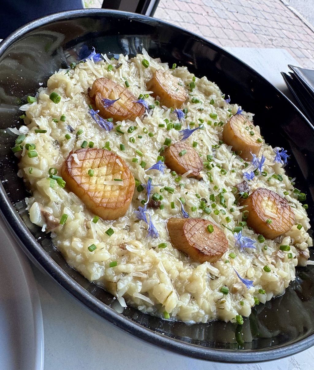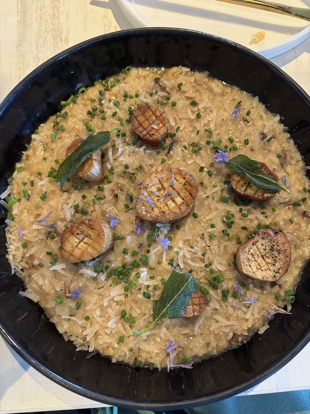 I had the risotto with "scallops", very beautiful presentation, with little blue flowers decorating. A cocktail, and they used fleurs de sel to rim it, rather than plain salt. And a gorgeous little lemon tart, with meringue, plate beautifully decorated with coulis and more meringue.
