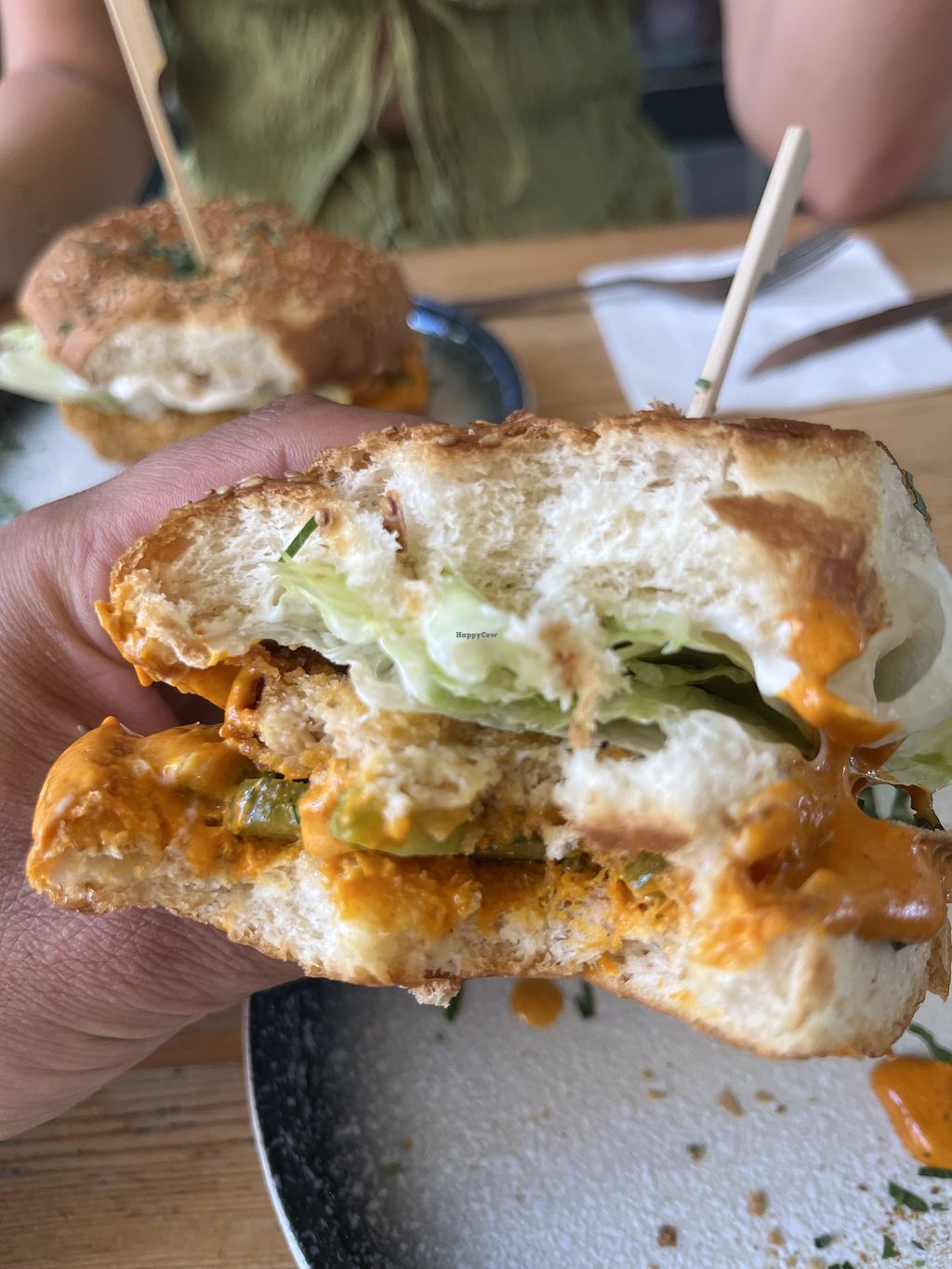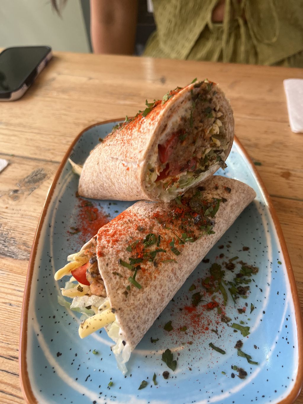 The most amazing vegan chicken burger with homemade cashew cheese. Tuna wrap was incredible too. These guys are clearly passionate about what they do, the chef came out himself to explain the elements of the dishes to us.