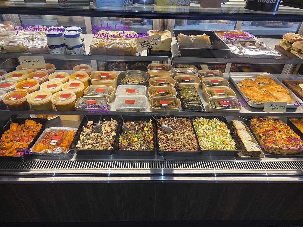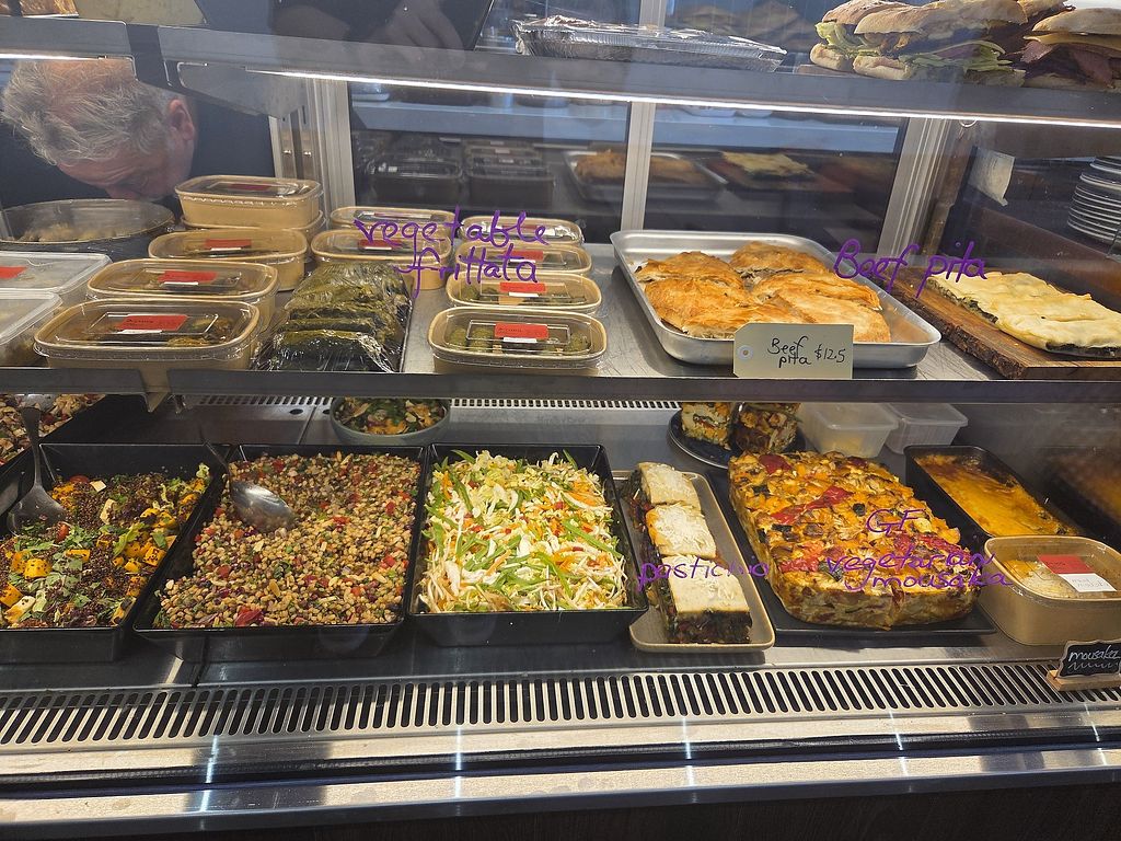 Serves meat, vegan options available. Greek cafe and deli offering vegan choices such as stuffed peppers & tomatoes, stuffed vine leaves, spinach pita, smashed avocado, spanakopita, trio of dips (made vegan on request), warm olives with pita and other specials. Call ia day in advance for more vegan and FODMAP choices. Open Tue-Thu 8:00am-5:00pm, Fri 8:00am-9:00pm, Sat-Sun 8:00am-3:00pm. Closed Mon.