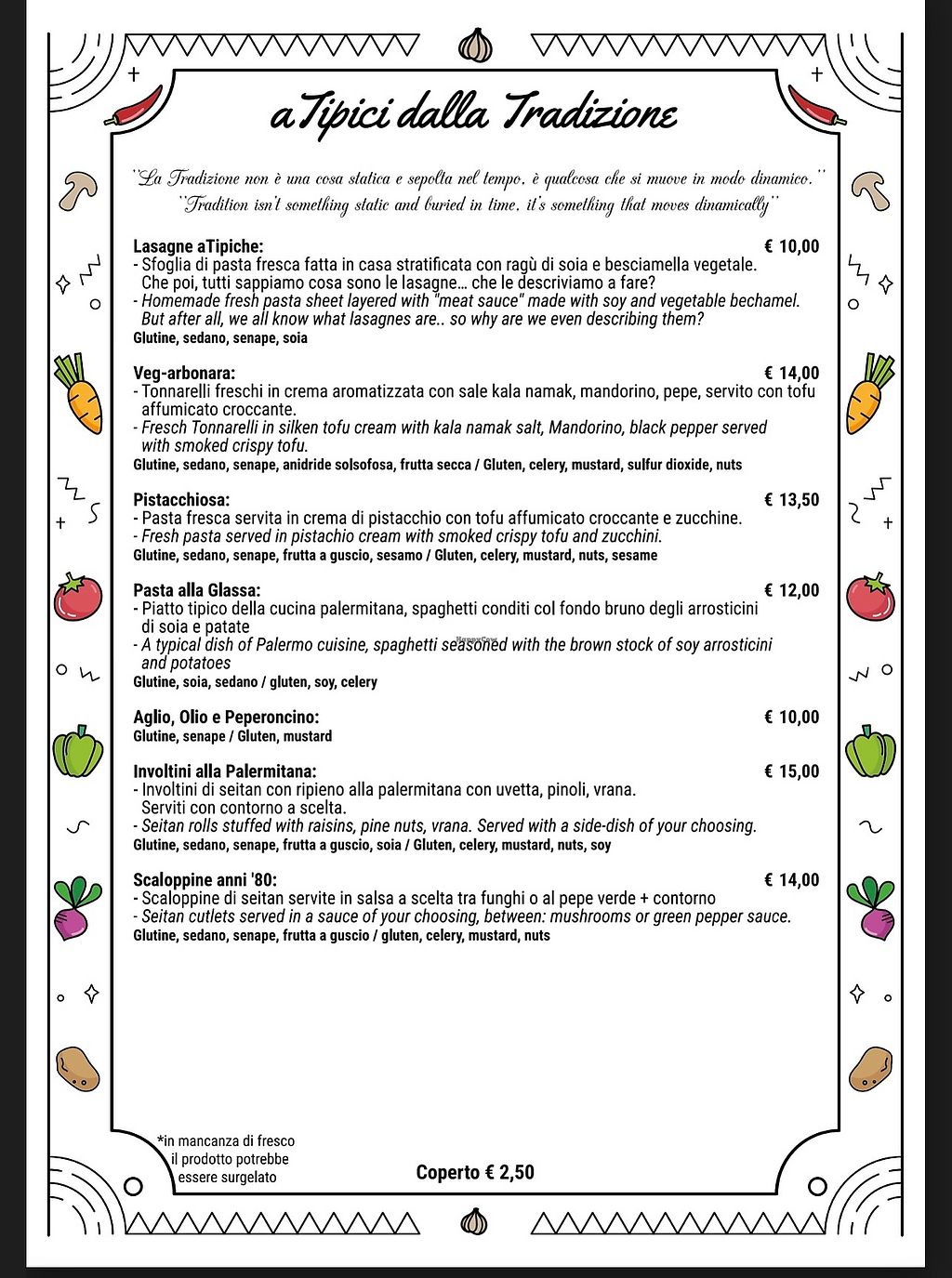 Testé les lasagnes et les pâtes à la pistache, ces dernières étaient vraiment très bonnes ! Le fromage vegan en entrée est bon aussi, attention car c'est copieux ! Pas d'extérieur il me semble mais une jolie salle dans le centre mais sans la foule, à faire en étant sur Palerme.