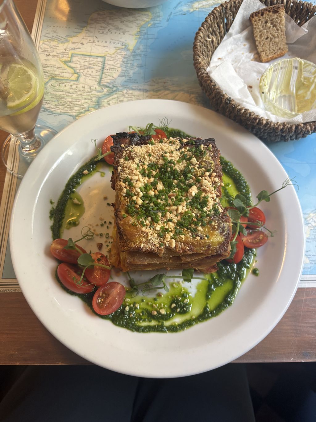We tried the snack plate, lasagne, Atlas burger and tofu manilla followed by tiramisu and a raw chocolate cake. Each meal was delicious! The lasagne had an amazing flavour and was super filling. The tofu manilla was a large portion and full of flavour too. You couldn’t go wrong with the burger and the wedges served alongside were especially nice and crispy. The tiramisu was again strongly flavoured while light and fluffy, and the raw chocolate cake was lovely and dark with plenty of nuts. We did like the cool tables with maps adding to its nice vibe too.