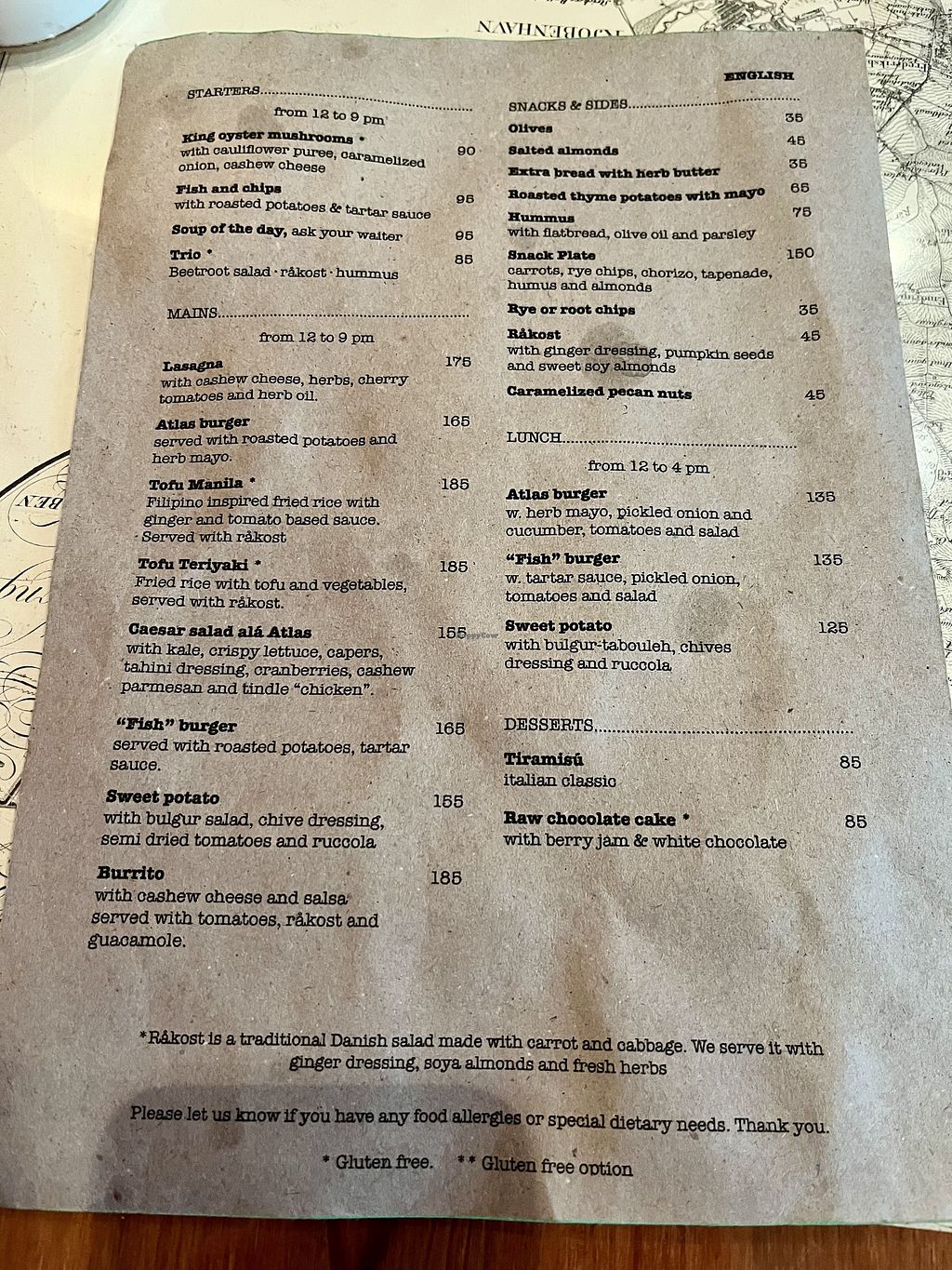 Es gibt ein paar ausgewählte Gerichte, welche aber sehr hochwertig und sehr lecker sind. Auf jeden Fall einen Besuch wert. Wir hatten die Lasagne und den Atlas Burger, absolut empfehlenswert. Der Services ist ebenfalls sehr freundlich und zuvorkommend, zusätzlich gab es frisches selbstgemachtes Brot mit Kräuterbutter. Natürlich alles vegan/plantbased. Ist für deutsche Verhältnisse ziemlich teuer, aber jeden Cent wert. In Dänemark/Kopenhagen sind die Preise aber üblich. Vom Ambiente, welches rustikal wirkt, sollte man sich nicht abschrecken lassen, das Essen ist umso besser 😉