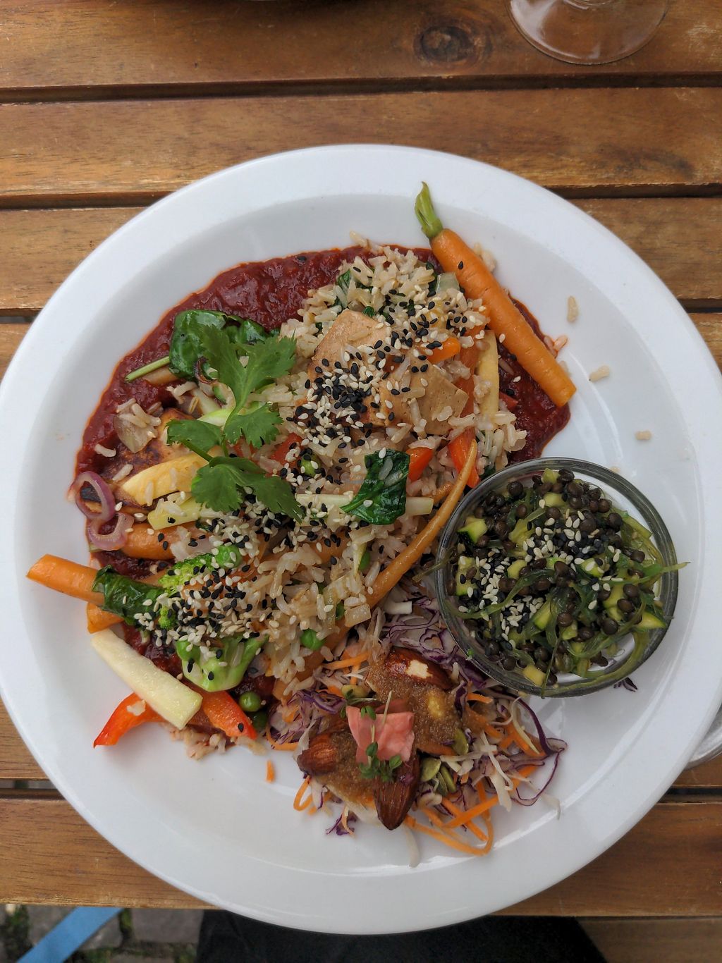 Lasagne with cashew cheese, tomato salad, råkost and thatziki