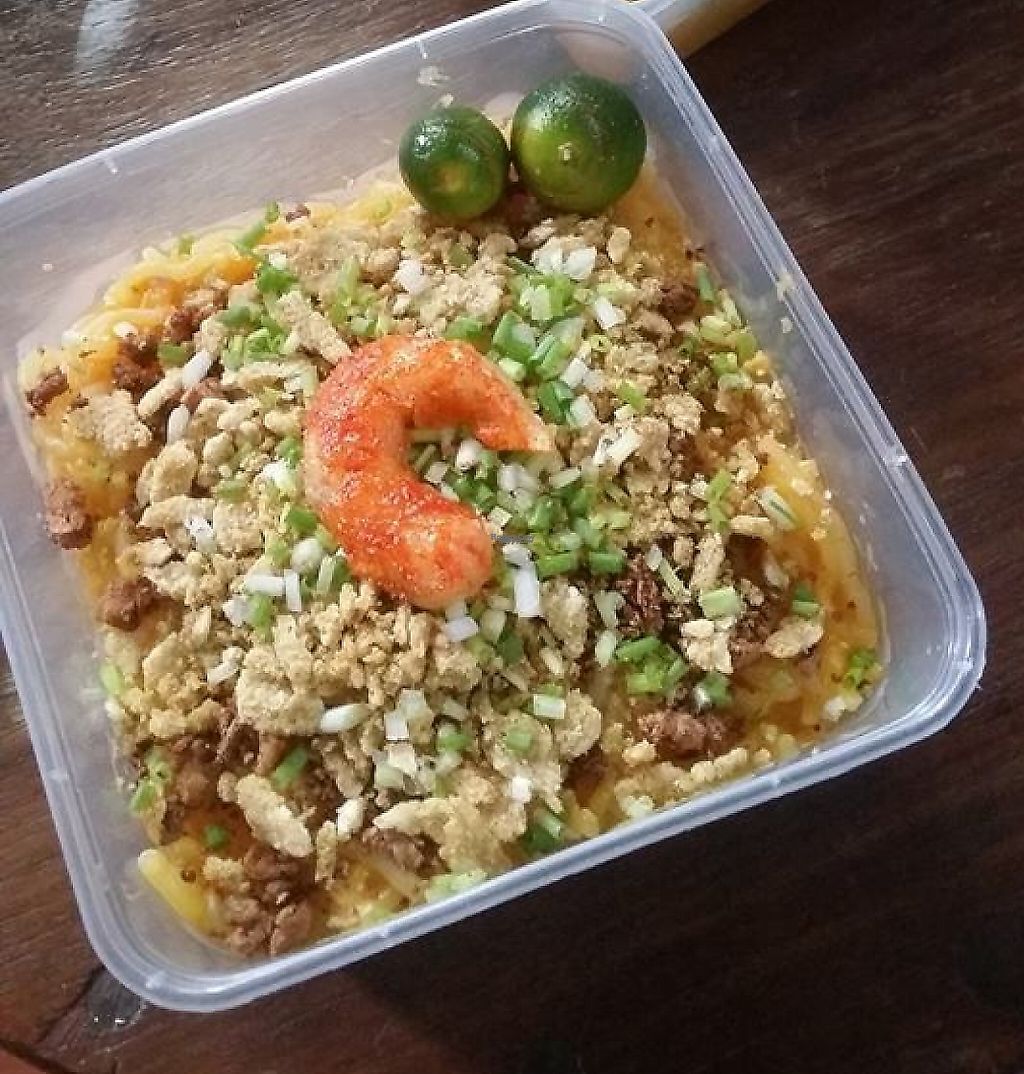vegetarian pancit palabok with veggie shrimp