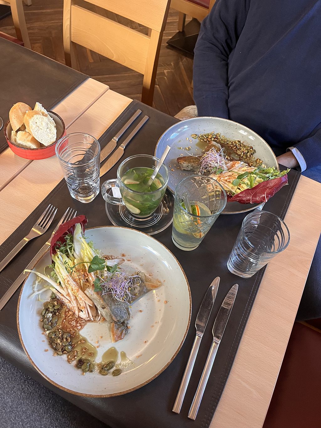 Nice greeting from the kitchen, pumpkin soup, bread with tapenade and …