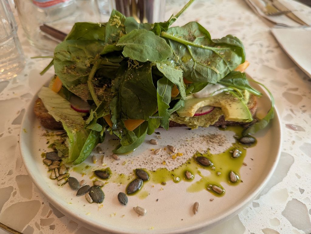 I had the vegan toast which comes with avocado, pea hummus, spinach and more. Really tasty. Slightly smaller portion size than non vegan food though.