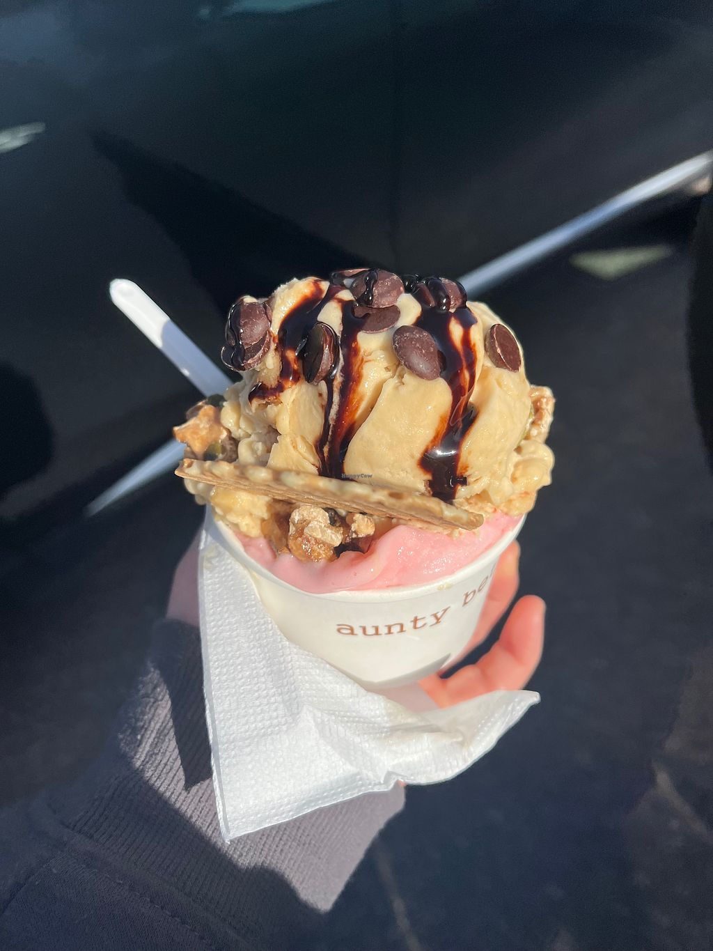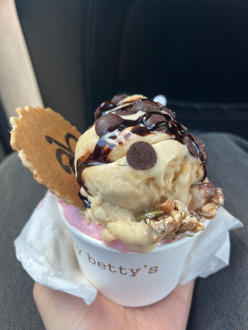 vegan caramel in cone with wafer and dark choc chips