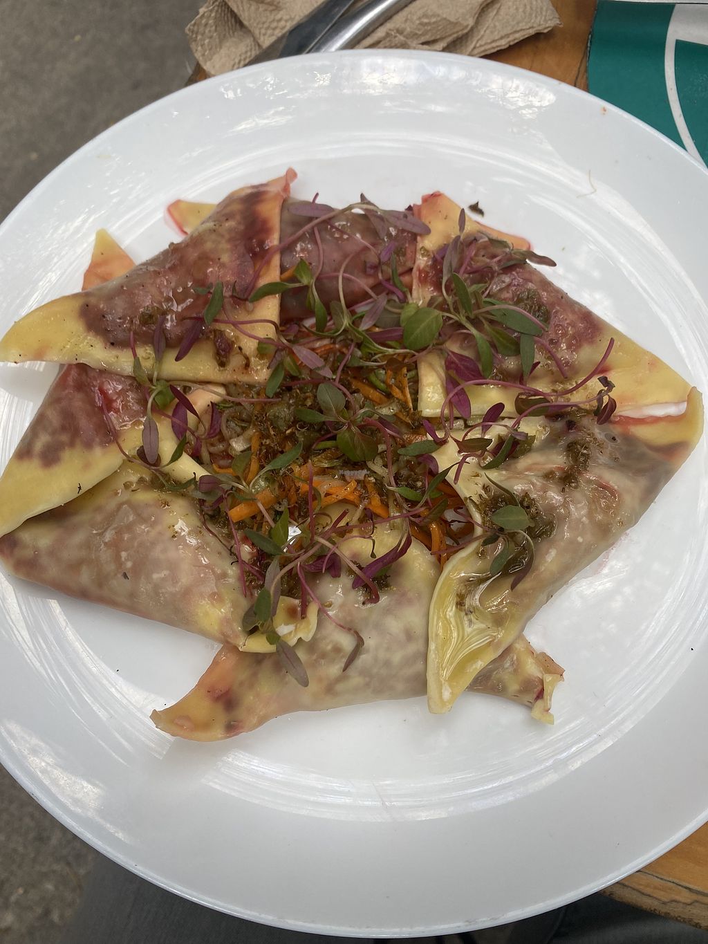 Really good beet ravioli! Would go back for the ravioli. We also tried the tabbouleh, gazpacho, and a juice, all of which were pretty good. The main downside is that the portions are pretty small for the cost. For instance, the ravioli only has 4-5 ravioli.