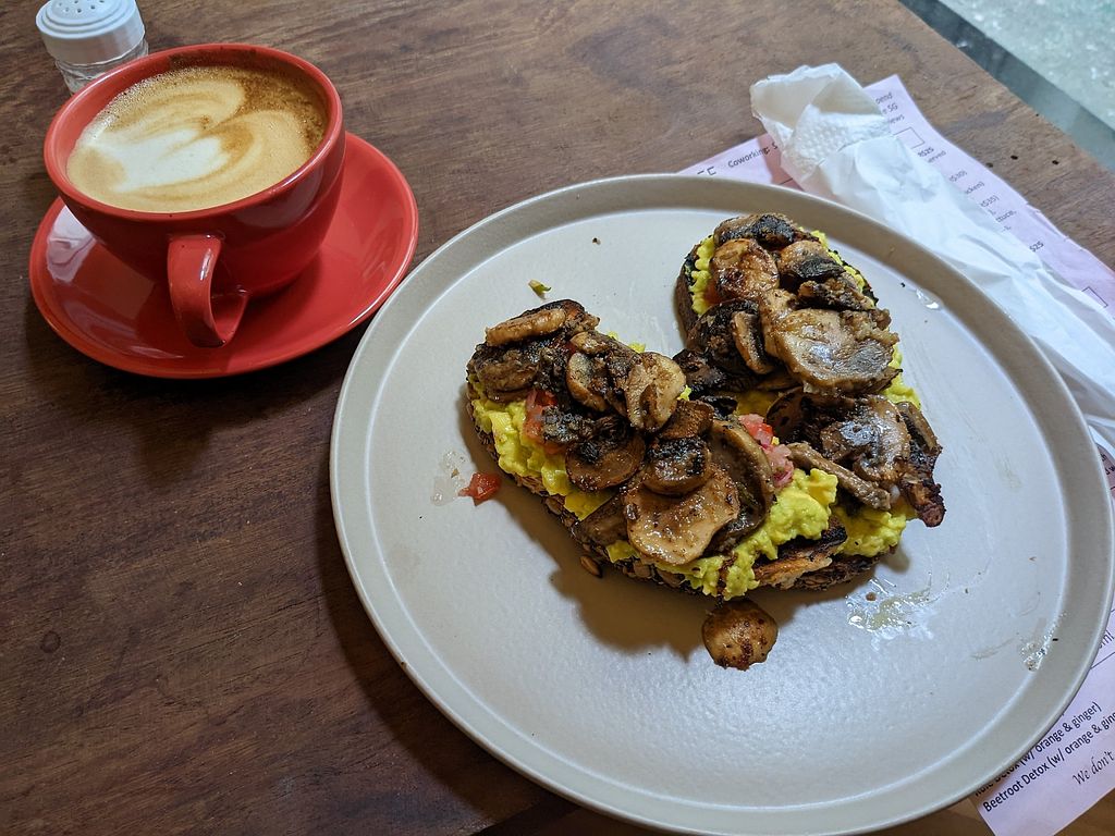Enjoyed avocado on toast, the egg replaced with mushrooms with coffee latte with oat milk.