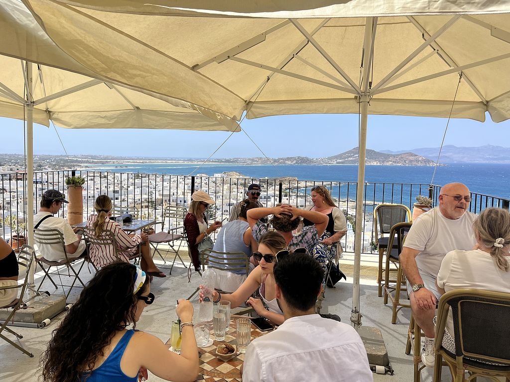 Serves meat, vegan options available. Restaurant and wine bar located on the rooftop of an old monastery of Ursulines next to the Castle of Naxos overlooking the town and the sea. Offers a few vegan and veganizable choices such as chickpea salad and grilled celery with cashew cream. Open Mon-Sun 8:30am-1:30am. Hours are subject to season - check ahead.