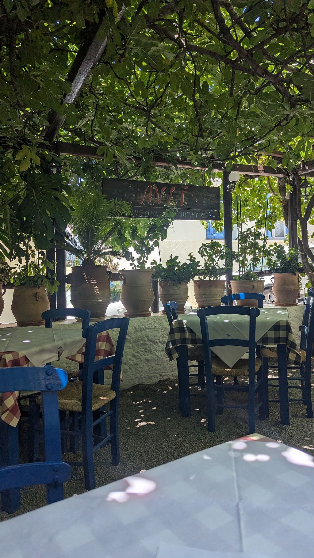 I haf the fava and spinach pies, a Freddy cappuccino with alpro vanilla milk was awesome. The terrace is in the Shade with many trees, kept from the main crowd, the owner is really nice and the food is fresh