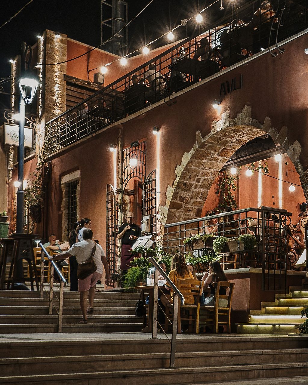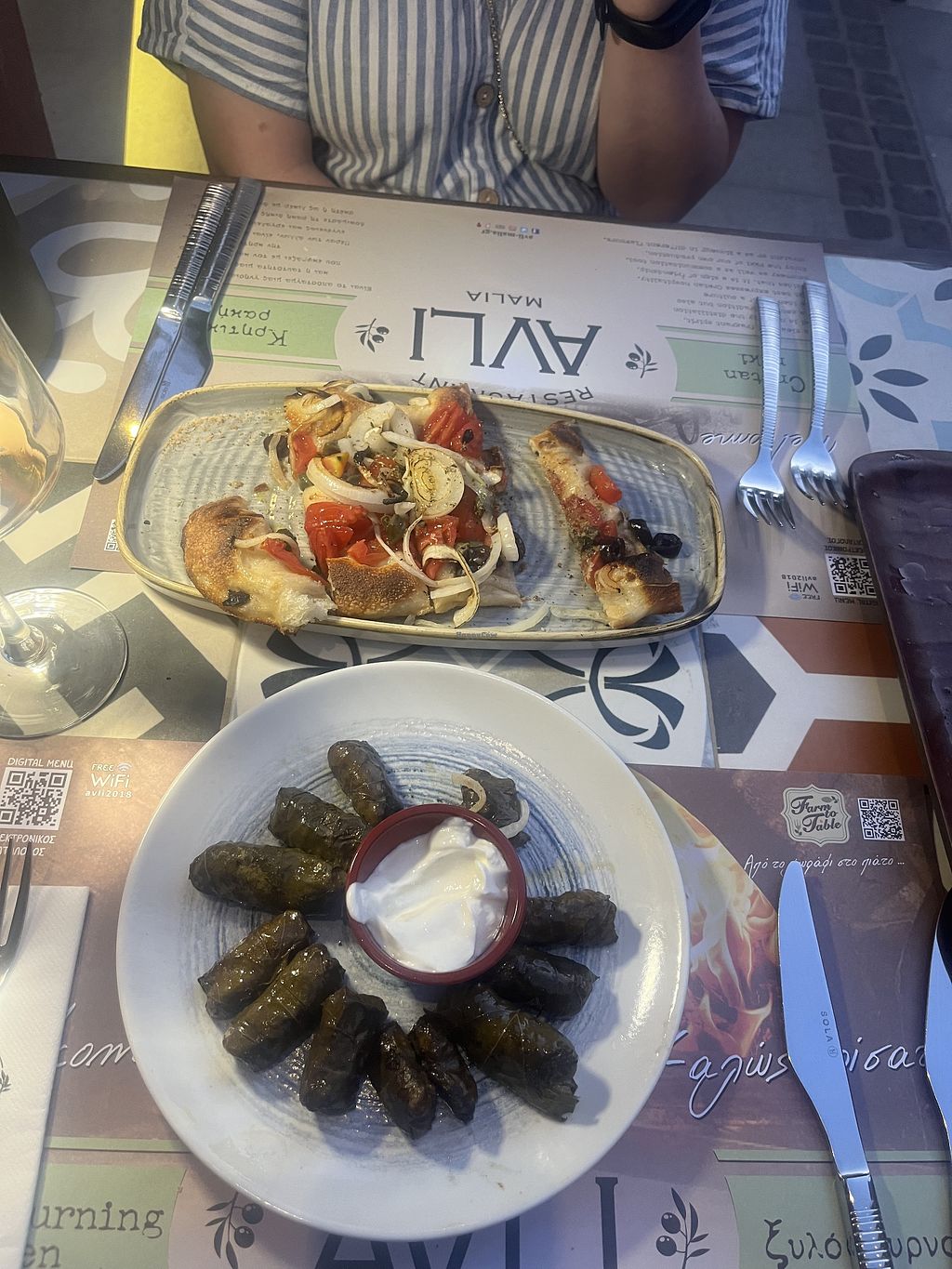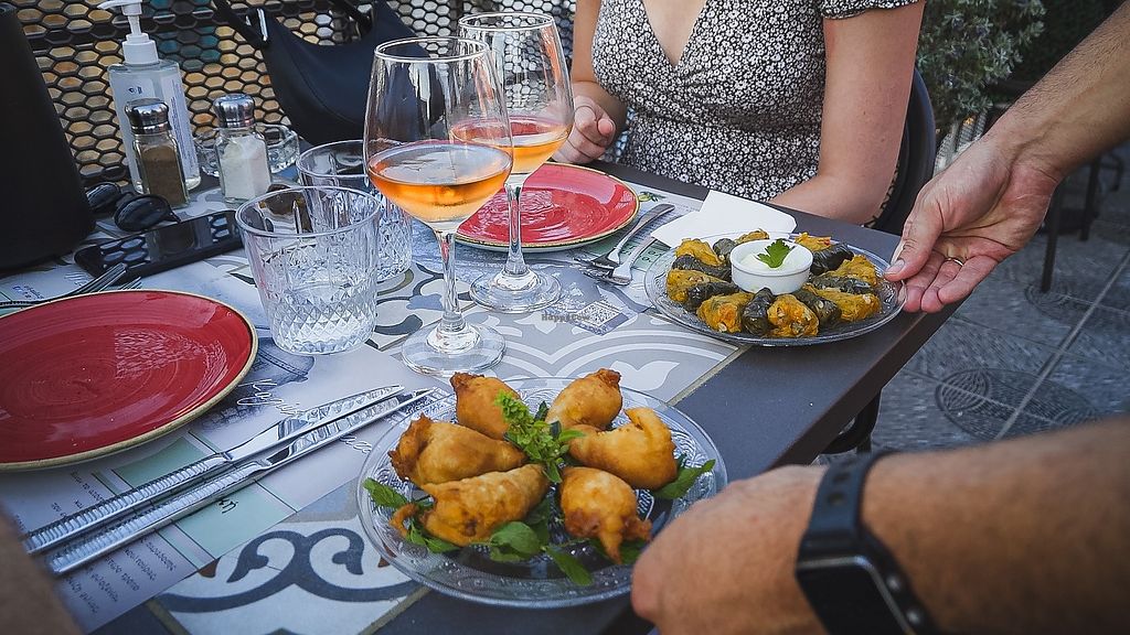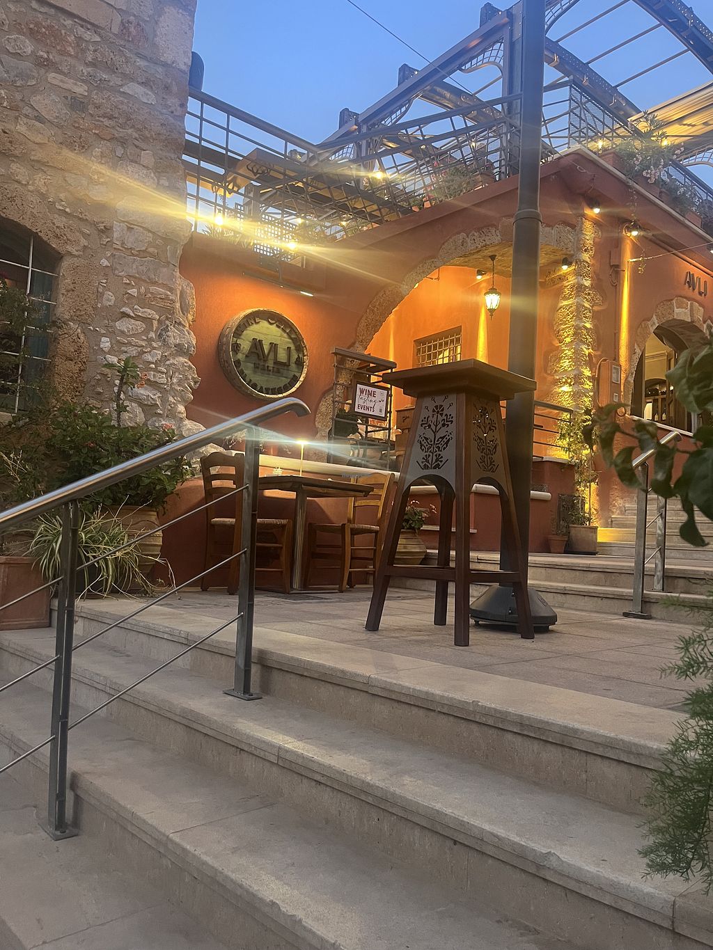 In Avli I joined a group of non-vegetarians. I enjoyed a fresh and creative vegetarian dish: stuffed zucchini flowers. The temperature on the terrace was cool, although no airconditioning was used. The staff was friendly and the music pleasant. We had great appetizers on the house!