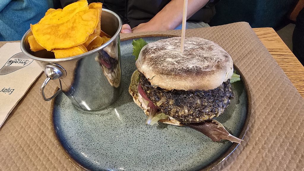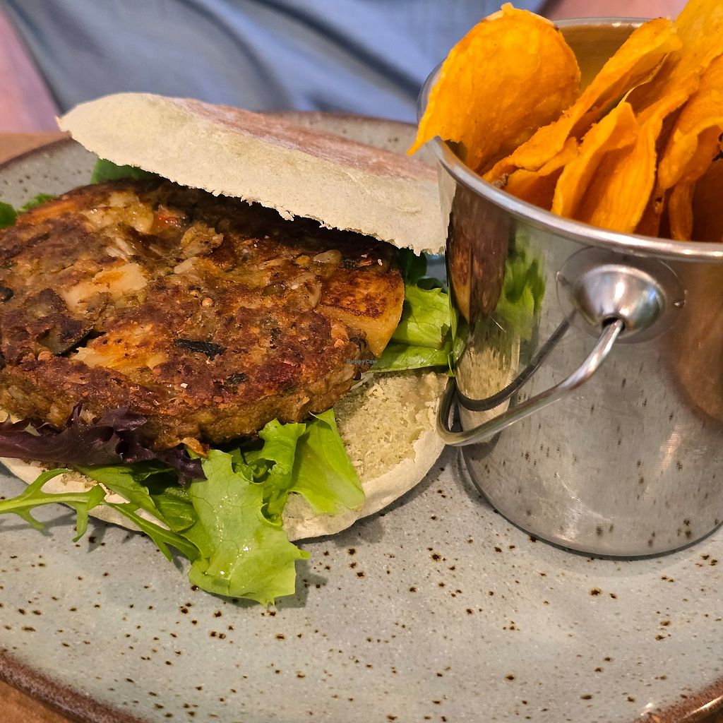 Several vegan items on the menu, including a few burgers, brunch, desserts, etc. There’s a soup of the day (not sure if it’s always vegan). Also, alcoholic and non-alcoholic drinks, smoothies with almond or coconut milk, wraps, bowls, salads. I enjoyed the mushroom-eggplant-lentil burger, with really good vegan curry mayo. It came with some sweet-potato chips (crisps, not fries). One of the two desserts today was vegan. It was a busy place on a Friday at 12:30 pm, and the staff was pleasant and hard-working. There is seating outside, when the weather is good.